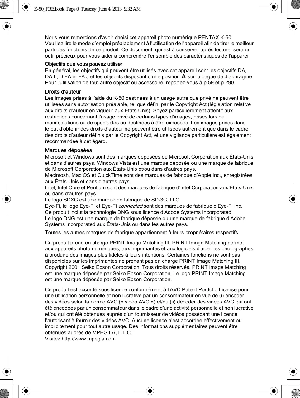 - Les caractéristiques et les dimensions extérieures peuvent être sujettes à modification sans préavis. OPK500202-FR Copyright © PENTAX RICOH IMAGING CO., LTD. 2013 FOM 01.06.2013 Printed in Europe La lecture du mode d’emploi vous permettra de bénéficier d’un fonctionnement optimal de votre appareil. K-50_FRE.book Page 0 Tuesday, June 4, 2013 9:32 AM Nous vous remercions d’avoir choisi cet appareil photo numérique PENTAX K-50 . Veuillez lire le mode d’emploi préalablement à l’utilisation de l’appareil afin de tirer le meilleur parti des fonctions de ce produit. Ce document, qui est à conserver après lecture, sera un outil précieux pour vous aider à comprendre l’ensemble des caractéristiques de l’appareil. Objectifs que vous pouvez utiliser En général, les objectifs qui peuvent être utilisés avec cet appareil sont les objectifs DA, DA L, D FA et FA J et les objectifs disposant d’une position s sur la bague de diaphragme. Pour l’utilisation de tout autre objectif ou accessoire, reportez-vous à p.59 et p.290. Droits d’auteur Les images prises à l’aide du K-50 destinées à un usage autre que privé ne peuvent être utilisées sans autorisation préalable, tel que défini par le Copyright Act (législation relative aux droits d’auteur en vigueur aux États-Unis). Soyez particulièrement attentif aux restrictions concernant l’usage privé de certains types d’images, prises lors de manifestations ou de spectacles ou destinées à être exposées. Les images prises dans le but d’obtenir des droits d’auteur ne peuvent être utilisées autrement que dans le cadre des droits d’auteur définis par le Copyright Act, et une vigilance particulière est également recommandée à cet égard. Marques déposées Microsoft et Windows sont des marques déposées de Microsoft Corporation aux États-Unis et dans d'autres pays. Windows Vista est une marque déposée ou une marque de fabrique de Microsoft Corporation aux États-Unis et/ou dans d'autres pays. Macintosh, Mac OS et QuickTime sont des marques de fabrique d’Apple Inc., enregistrées aux États-Unis et dans d’autres pays. Intel, Intel Core et Pentium sont des marques de fabrique d’Intel Corporation aux États-Unis ou dans d’autres pays. Le logo SDXC est une marque de fabrique de SD-3C, LLC. Eye-Fi, le logo Eye-Fi et Eye-Fi connected sont des marques de fabrique d’Eye-Fi Inc. Ce produit inclut la technologie DNG sous licence d’Adobe Systems Incorporated. Le logo DNG est une marque de fabrique déposée ou une marque de fabrique d’Adobe Systems Incorporated aux États-Unis ou dans les autres pays. Toutes les autres marques de fabrique appartiennent à leurs propriétaires respectifs. Ce produit prend en charge PRINT Image Matching III. PRINT Image Matching permet aux appareils photo numériques, aux imprimantes et aux logiciels d'aider les photographes à produire des images plus fidèles à leurs intentions. Certaines fonctions ne sont pas disponibles sur les imprimantes ne prenant pas en charge PRINT Image Matching III. Copyright 2001 Seiko Epson Corporation. Tous droits réservés. PRINT Image Matching est une marque déposée par Seiko Epson Corporation. Le logo PRINT Image Matching est une marque déposée par Seiko Epson Corporation. Ce produit est accordé sous licence conformément à l’AVC Patent Portfolio License pour une utilisation personnelle et non lucrative par un consommateur en vue de (i) encoder des vidéos selon la norme AVC (« vidéo AVC ») et/ou (ii) décoder des vidéos AVC qui ont été encodées par un consommateur dans le cadre d’une activité personnelle et non lucrative et/ou qui ont été obtenues auprès d’un fournisseur de vidéos possédant une licence l’autorisant à fournir des vidéos AVC. Aucune licence n’est accordée effectivement ou implicitement pour tout autre usage. Des informations supplémentaires peuvent être obtenues auprès de MPEG LA, L.L.C. Visitez http://www.mpegla.com. K-50_FRE.book Page 1 Tuesday, June 4, 2013 9:32 AM À l’attention des utilisateurs de cet appareil