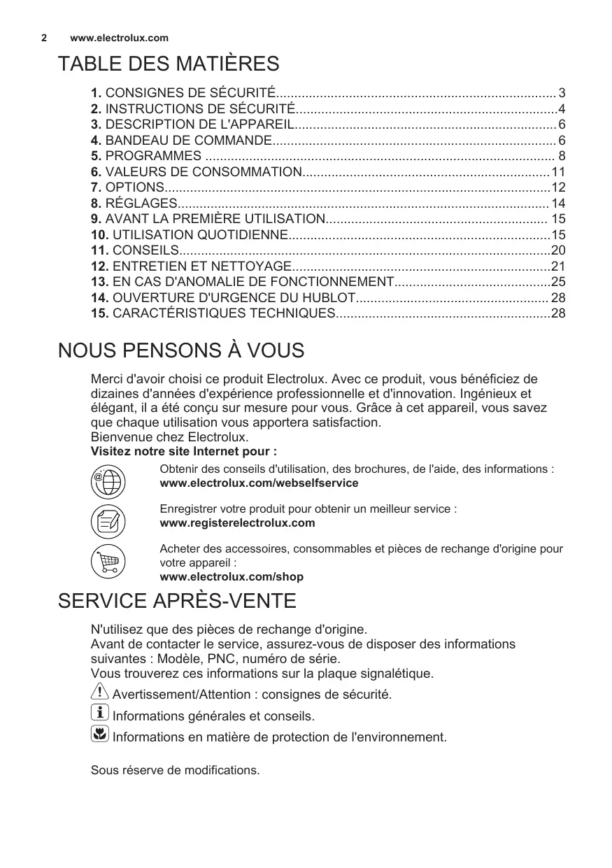 4. BANDEAU DE COMMANDE 6 5. PROGRAMMES 8 6. VALEURS DE CONSOMMATION11 7. OPTIONS12 SERVICE APRÈS-VENTE N'utilisez que des pièces de rechange d'origine. Avant de contacter le service, assurez-vous de disposer des informations suivantes : Modèle, PNC, numéro de série. Vous trouverez ces informations sur la plaque signalétique. Avertissement/Attention : consignes de sécurité. Informations générales et conseils. Informations en matière de protection de l'environnement. Sous réserve de modifications.