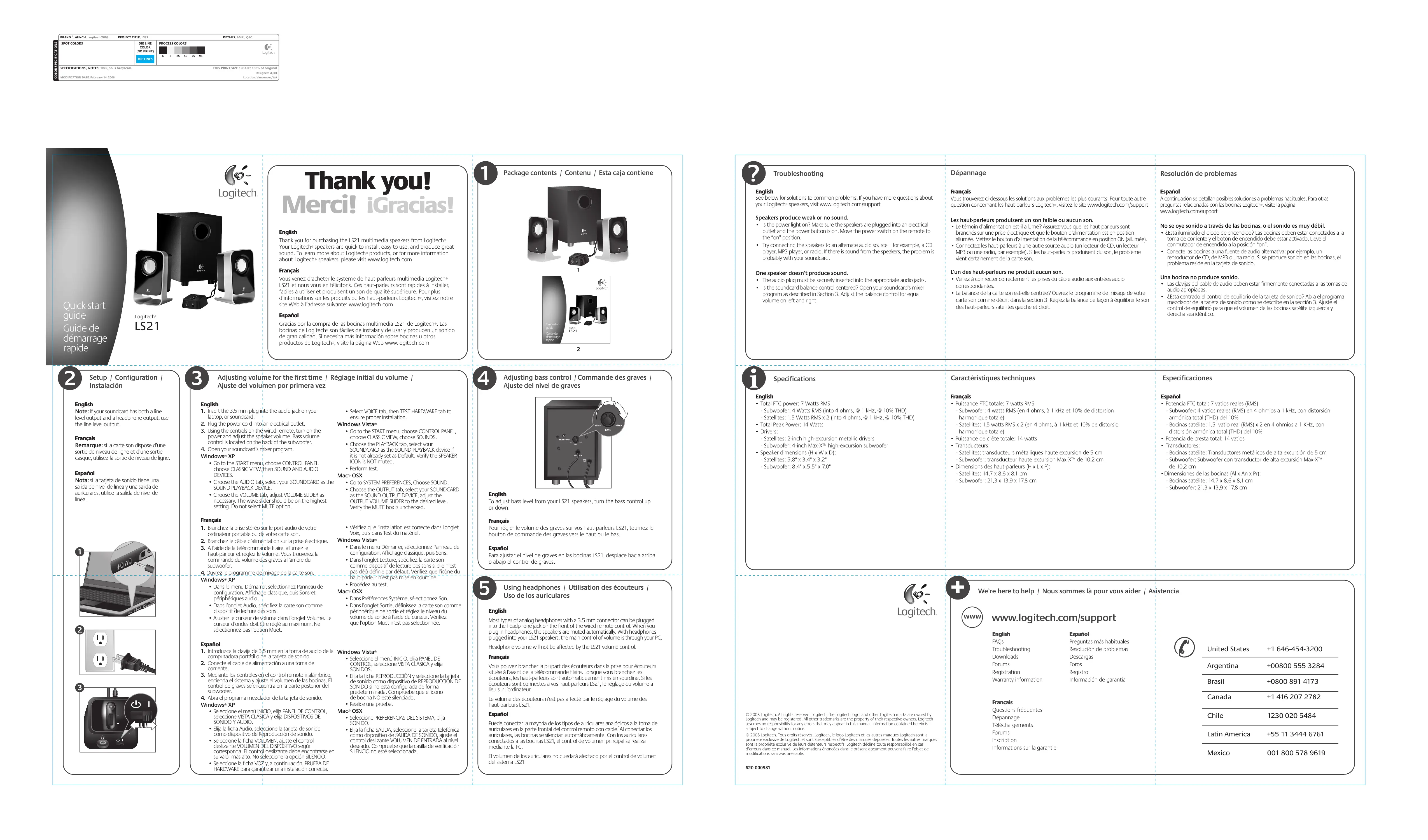 Using headphones / Utilisation des écouteurs / Uso de los auriculares English WWW Most types of analog headphones with a 3.5 mm connector can be plugged into the headphone jack on the front of the wired remote control. When you plug in headphones, the speakers are muted automatically. With headphones plugged into your LS21 speakers, the main control of volume is through your PC. Français Vous pouvez brancher la plupart des écouteurs dans la prise pour écouteurs située à l’avant de la télécommande filaire. Lorsque vous branchez les écouteurs, les haut-parleurs sont automatiquement mis en sourdine. Si les écouteurs sont connectés à vos haut-parleurs LS21, le réglage du volume a lieu sur l’ordinateur. Le volume des écouteurs n’est pas affecté par le réglage du volume des haut-parleurs LS21. Puede conectar la mayoría de los tipos de auriculares analógicos a la toma de auriculares en la parte frontal del control remoto con cable. Al conectar los auriculares, las bocinas se silencian automáticamente. Con los auriculares conectados a las bocinas LS21, el control de volumen principal se realiza mediante la PC. El volumen de los auriculares no quedará afectado por el control de volumen del sistema LS21. www.logitech.com/support English FAQs Troubleshooting Downloads Forums Registration Warranty information Headphone volume will not be affected by the LS21 volume control. Español We’re here to help / Nous sommes là pour vous aider / Asistencia © 2008 Logitech. All rights reserved. Logitech, the Logitech logo, and other Logitech marks are owned by Logitech and may be registered. All other trademarks are the property of their respective owners. Logitech assumes no responsibility for any errors that may appear in this manual. Information contained herein is subject to change without notice. © 2008 Logitech. Tous droits réservés. Logitech, le logo Logitech et les autres marques Logitech sont la propriété exclusive de Logitech et sont susceptibles d’être des marques déposées. Toutes les autres marques sont la propriété exclusive de leurs détenteurs respectifs. Logitech décline toute responsabilité en cas d’erreurs dans ce manuel. Les informations énoncées dans le présent document peuvent faire l’objet de modifications sans avis préalable. 620-000981 Français Questions fréquentes Dépannage Téléchargements Forums Inscription Informations sur la garantie Español Preguntas más habituales Resolución de problemas Descargas Foros Registro Información de garantía United States +1 646-454-3200 Argentina +00800 555 3284 Brasil +0800 891 4173 Canada +1 416 207 2782 Chile