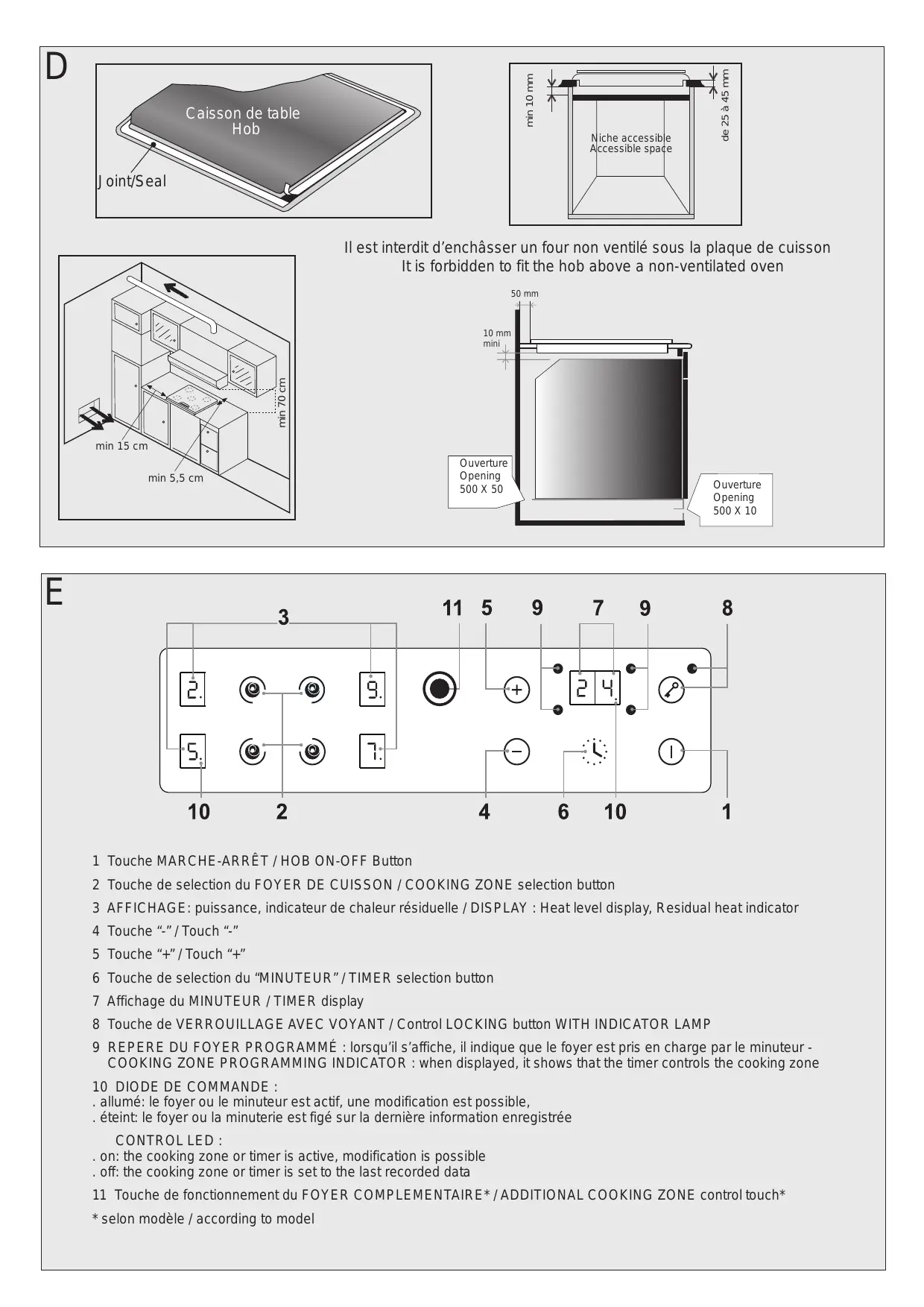 Il est interdit d'enchâsser un four non ventilé sous la plaque de cuisson. It is forbidden to fit the hob above a non-ventilated oven