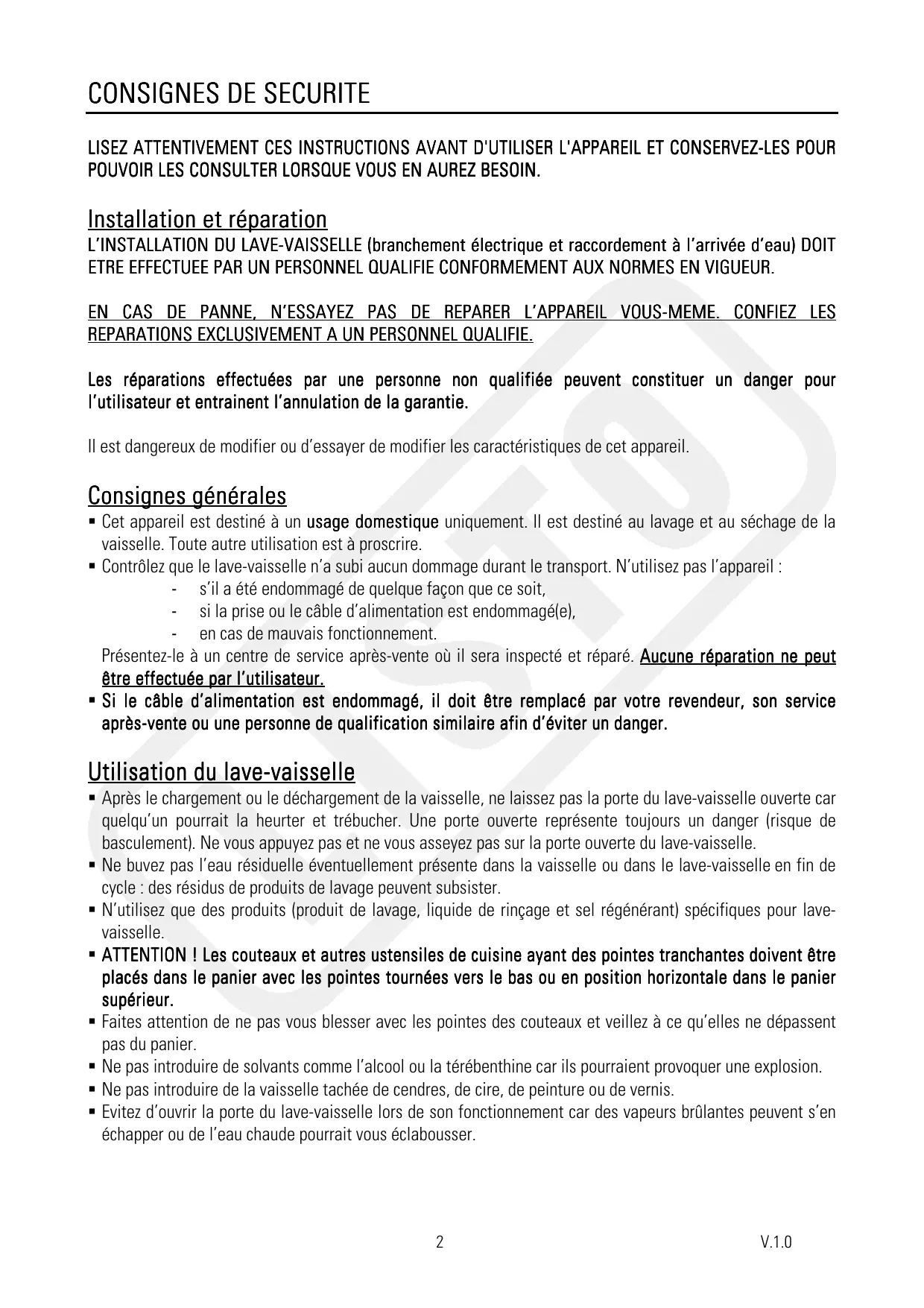 L’APPAREIL VOUSVOUS - MEME. CONFIEZ LES REPARATIONS EXCLUSIVEMENT EXCLUSIV EMENT A UN PERSONNEL QUALIFIE. Les réparations effectuées par une personne non qualifiée peuvent constituer un danger pour l’utilisateur et entrainent l’annulation de la garantie. Il est dangereux de modifier ou d’essayer de modifier les caractéristiques de cet appareil. Consignes générales Cet appareil est destiné à un usage domestique uniquement. Il est destiné au lavage et au séchage de la vaisselle. Toute autre utilisation est à proscrire. Contrôlez que le lave-vaisselle n’a subi aucun dommage durant le transport. N’utilisez pas l’appareil : - s’il a été endommagé de quelque façon que ce soit, - si la prise ou le câble d’alimentation est endommagé(e), - en cas de mauvais fonctionnement. Présentez-le à un centre de service après-vente où il sera inspecté et réparé. Aucune réparation ne peut être effectuée par l’utilisateur. Si le câble d’alimentation est endommagé, il doit être remplacé par votre revendeur, son service aprèsaprès - vente ou une personne de qualification qualific ation similaire afin d’éviter un danger. Utilisation du lavelave- vaisselle Après le chargement ou le déchargement de la vaisselle, ne laissez pas la porte du lave-vaisselle ouverte car quelqu’un pourrait la heurter et trébucher. Une porte ouverte représente toujours un danger (risque de basculement). Ne vous appuyez pas et ne vous asseyez pas sur la porte ouverte du lave-vaisselle. Ne buvez pas l’eau résiduelle éventuellement présente dans la vaisselle ou dans le lave-vaisselle en fin de cycle : des résidus de produits de lavage peuvent subsister. N’utilisez que des produits (produit de lavage, liquide de rinçage et sel régénérant) spécifiques pour lavevaisselle. ATTENTION ! Les couteaux et autres ustensiles de cuisine ayant des pointes tranchantes doivent être êtr e placés dans le panier avec les pointes tournées vers le bas ou en position horizontale dans le panier supérieur. Faites attention de ne pas vous blesser avec les pointes des couteaux et veillez à ce qu’elles ne dépassent pas du panier. Ne pas introduire de solvants comme l’alcool ou la térébenthine car ils pourraient provoquer une explosion. Ne pas introduire de la vaisselle tachée de cendres, de cire, de peinture ou de vernis. Evitez d’ouvrir la porte du lave-vaisselle lors de son fonctionnement car des vapeurs brûlantes peuvent s’en échapper ou de l’eau chaude pourrait vous éclabousser.