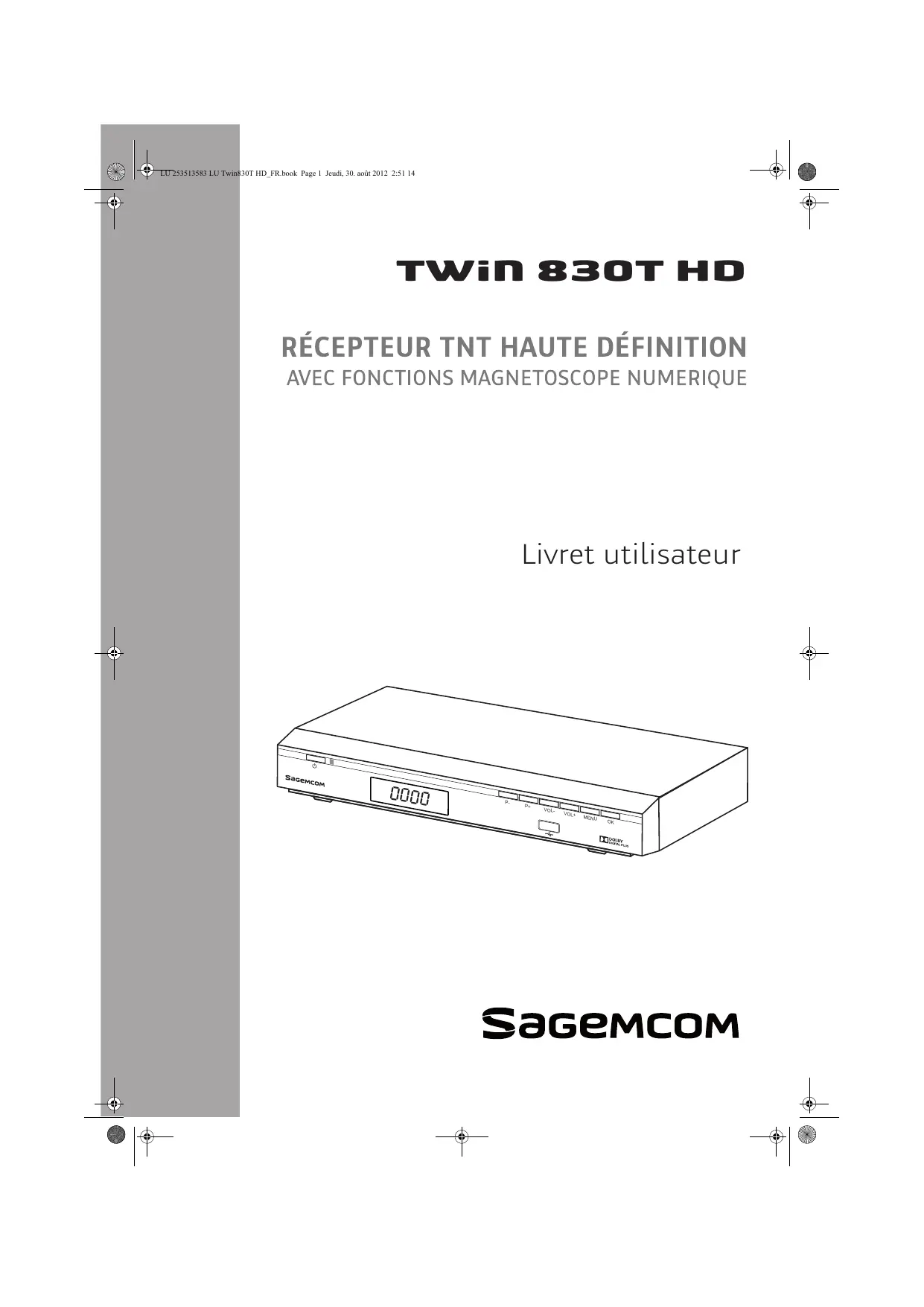 LU 253513583 LU Twin830T HD_FR.book Page 2 Jeudi, 30. août 2012 2:51 14 Twin 830T HD Toutes nos félicitations ! La nouvelle génération de récepteurs vous ouvre les portes des derniers services numériques en haute définition et vous permet, ainsi qu'à votre famille, de choisir aisément parmi les meilleures fonctions de la télévision numérique. Dès que vous aurez raccordé votre récepteur, vous pourrez profiter de la totalité des services. Vous pourrez mettre à jour votre récepteur par le signal reçu si de nouvelles fonctions ou nouveaux services sont disponibles. Le récepteur Sagemcom suit une stratégie de développement continu. Nous nous réservons donc le droit d'apporter, sans préavis, des modifications et améliorations au produit décrit dans ce livret utilisateur. Marquage CE : Le marquage CE atteste de la conformité des produits aux exigences essentielles de la directive R&TTE 1999/5/CE relative aux équipements hertziens et de télécommunication, ainsi qu'aux directives 2006/95/CE sur la sécurité, 2004/108/CE concernant la compatibilité électromagnétique et ErP 2009/125/CE relative aux exigences d’écoconception, définies par le Parlement européen et le Conseil afin de minimiser les interférences électromagnétiques, assurer la sécurité des utilisateurs et de leurs biens ainsi que préserver leur santé, et réduire l'impact des produits sur l'environnement. La déclaration de conformité CE peut être consultée sur le site www.sagemcom.com de Sagemcom, dans la section "Support", ou obtenue à l'adresse suivante : Sagemcom Broadband SAS - Service des relations clientèle 250, route de l'Empereur 92848 Rueil-Malmaison Cedex - FRANCE Copyright © Sagemcom Broadband SAS Tous droits réservés Sagemcom est une marque déposée. Ce terminal de réception Haute Définition Sagemcom répond aux spécifications "HD TV", et intègre la technologie HDMI™. Le logo "HD TV" est une marque de DIGITALEUROPE. HDMI, le logo HDMI et High-Definition Multimedia Interface sont des marques ou des marques déposées de HDMI Licensing LLC. Fabriqué sous licence de Dolby Laboratories. Dolby et le symbole double-D sont des marques déposées de Dolby Laboratories. IMPORTANT Avant de raccorder ce produit, veuillez vous renseigner sur la disponibilité de la Télévision Numérique Terrestre dans votre région. Nous vous recommandons de faire périodiquement une recherche de chaînes afin de profiter pleinement de votre récepteur (modification de signal, nouveaux services, mise à jour logicielle…). Conservez soigneusement ce livret utilisateur. Il vous sera utile en cas d’évolution des chaînes disponibles sur la TNT ; vous y trouverez notamment la procédure de recherche de chaînes.
