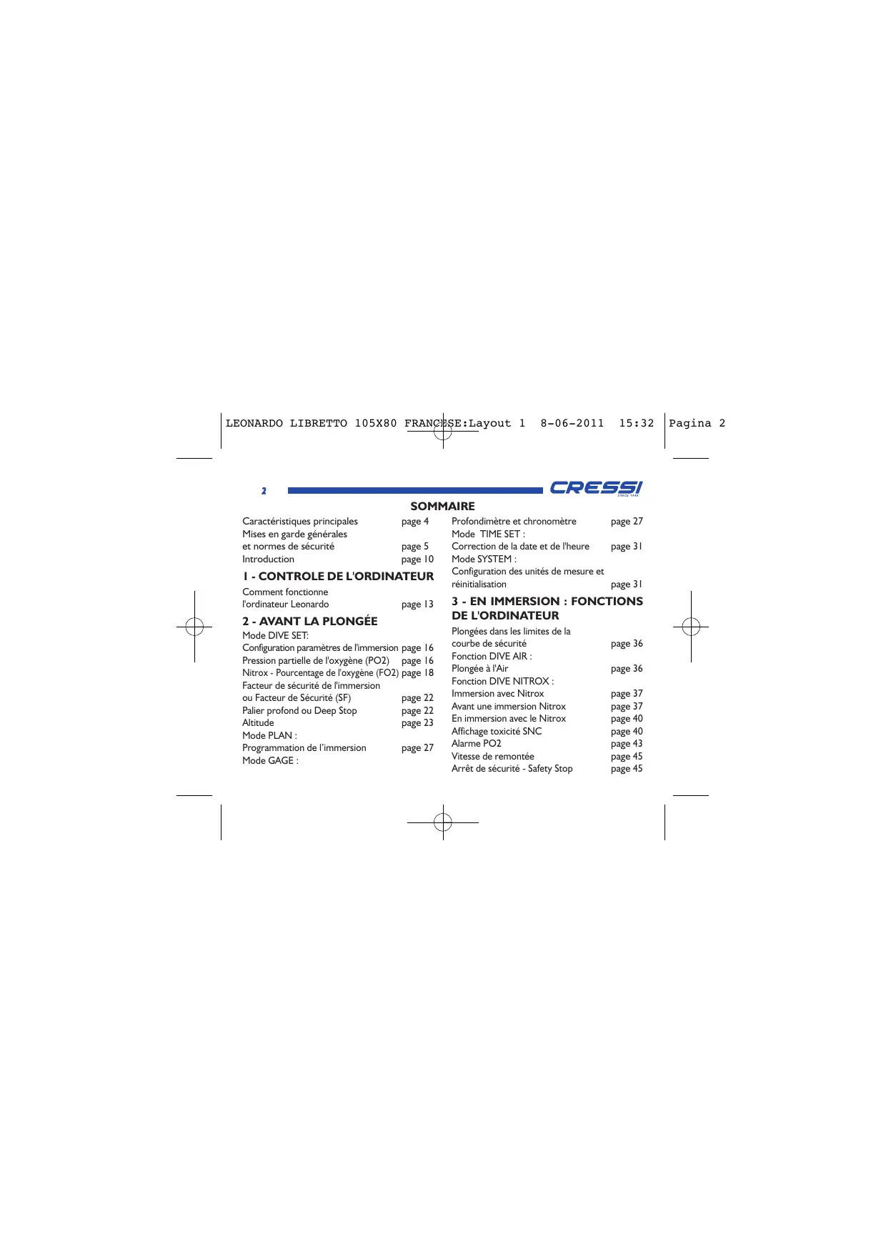 DE L'ORDINATEUR Plongées dans les limites de la courbe de sécurité Fonction DIVE AIR : Plongée à l'Air Fonction DIVE NITROX : Immersion avec Nitrox Avant une immersion Nitrox En immersion avec le Nitrox Affichage toxicité SNC Alarme PO2 Vitesse de remontée Arrêt de sécurité - Safety Stop page 36 page 36 page 37 page 37 page 40 page 40 page 43 page 45 page 45 Pagina 2 LEONARDO LIBRETTO 105X80 FRANCESE:Layout 1 8-06-2011 15:32
