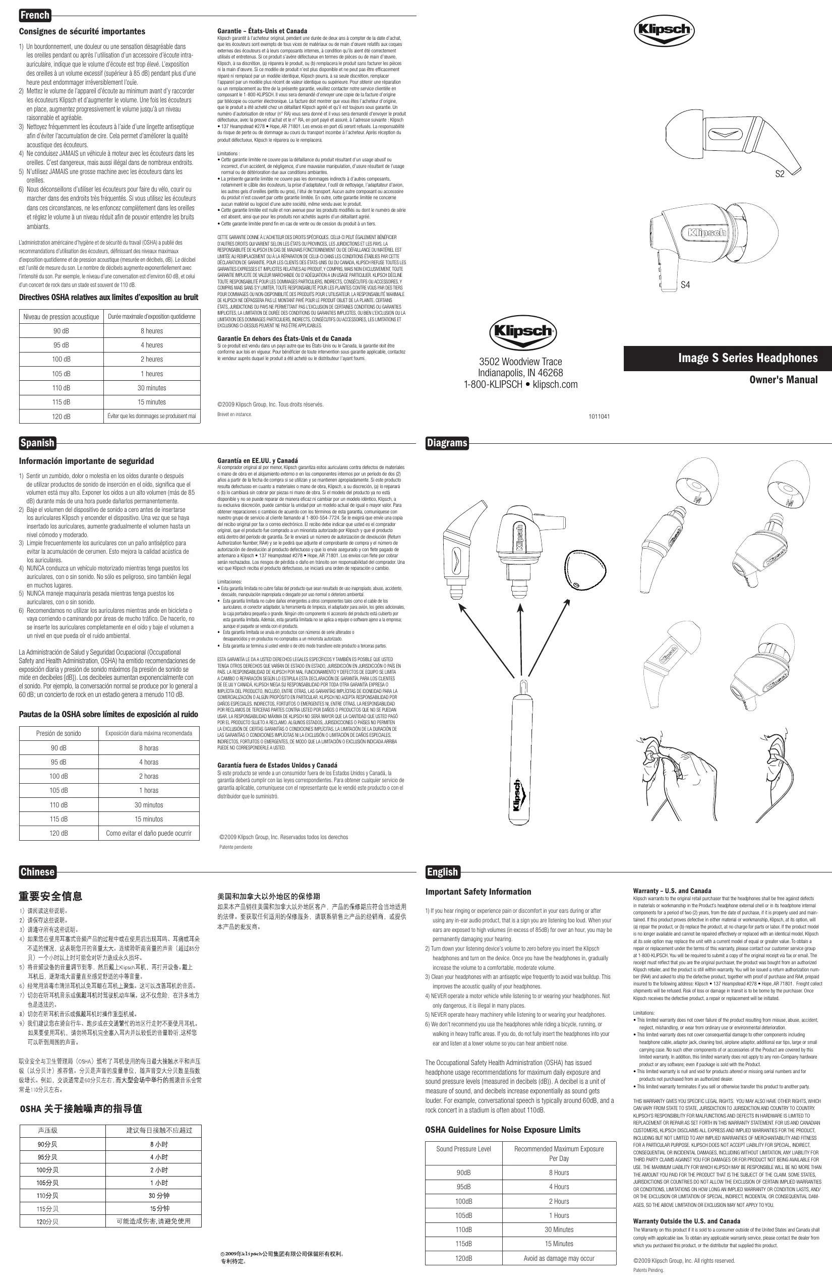 Garantie En dehors des États-Unis et du Canada Si ce produit est vendu dans un pays autre que les États-Unis ou le Canada, la garantie doit être conforme aux lois en vigueur. Pour bénéficier de toute intervention sous garantie applicable, contactez le vendeur auprès duquel le produit a été acheté ou le distributeur l’ayant fourni. Image S Series Headphones 3502 Woodview Trace Indianapolis, IN 46268 1-800-KLIPSCH • klipsch.com Owner's Manual ©2009 Klipsch Group, Inc. Tous droits réservés. Brevet en instance. Spanish