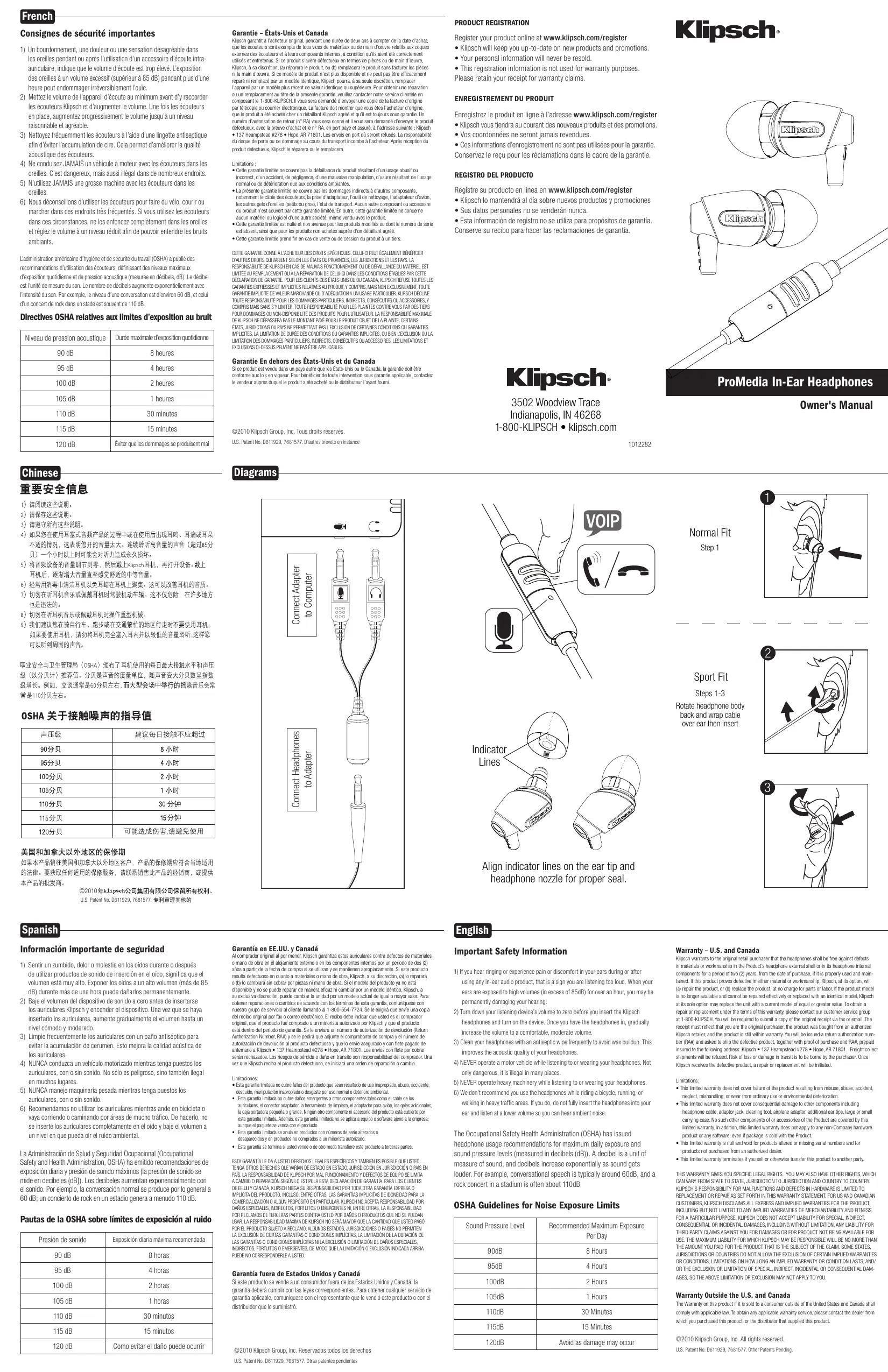 marcher dans des endroits très fréquentés. Si vous utilisez les écouteurs dans ces circonstances, ne les enfoncez complètement dans les oreilles et réglez le volume à un niveau réduit afin de pouvoir entendre les bruits ambiants. L’administration américaine d’hygiène et de sécurité du travail (OSHA) a publié des recommandations d’utilisation des écouteurs, définissant des niveaux maximaux d’exposition quotidienne et de pression acoustique (mesurée en décibels, dB). Le décibel est l’unité de mesure du son. Le nombre de décibels augmente exponentiellement avec l’intensité du son. Par exemple, le niveau d’une conversation est d’environ 60 dB, et celui d’un concert de rock dans un stade est souvent de 110 dB. Directives OSHA relatives aux limites d’exposition au bruit Niveau de pression acoustique Durée maximale d’exposition quotidienne 90 dB 8 heures 95 dB 4 heures 100 dB 2 heures 105 dB 1 heures 110 dB 30 minutes 115 dB 15 minutes 120 dB Éviter que les dommages se produisent mai PRODUCT REGISTRATION Garantie – États-Unis et Canada Klipsch garantit à l’acheteur original, pendant une durée de deux ans à compter de la date d’achat, que les écouteurs sont exempts de tous vices de matériaux ou de main d’œuvre relatifs aux coques externes des écouteurs et à leurs composants internes, à condition qu’ils aient été correctement utilisés et entretenus. Si ce produit s’avère défectueux en termes de pièces ou de main d’œuvre, Klipsch, à sa discrétion, (a) réparera le produit, ou (b) remplacera le produit sans facturer les pièces ni la main d’œuvre. Si ce modèle de produit n’est plus disponible et ne peut pas être efficacement réparé ni remplacé par un modèle identique, Klipsch pourra, à sa seule discrétion, remplacer l’appareil par un modèle plus récent de valeur identique ou supérieure. Pour obtenir une réparation ou un remplacement au titre de la présente garantie, veuillez contacter notre service clientèle en composant le 1-800-KLIPSCH. Il vous sera demandé d’envoyer une copie de la facture d’origine par télécopie ou courrier électronique. La facture doit montrer que vous êtes l’acheteur d’origine, que le produit a été acheté chez un détaillant Klipsch agréé et qu’il est toujours sous garantie. Un numéro d’autorisation de retour (n° RA) vous sera donné et il vous sera demandé d’envoyer le produit défectueux, avec la preuve d’achat et le n° RA, en port payé et assuré, à l’adresse suivante : Klipsch