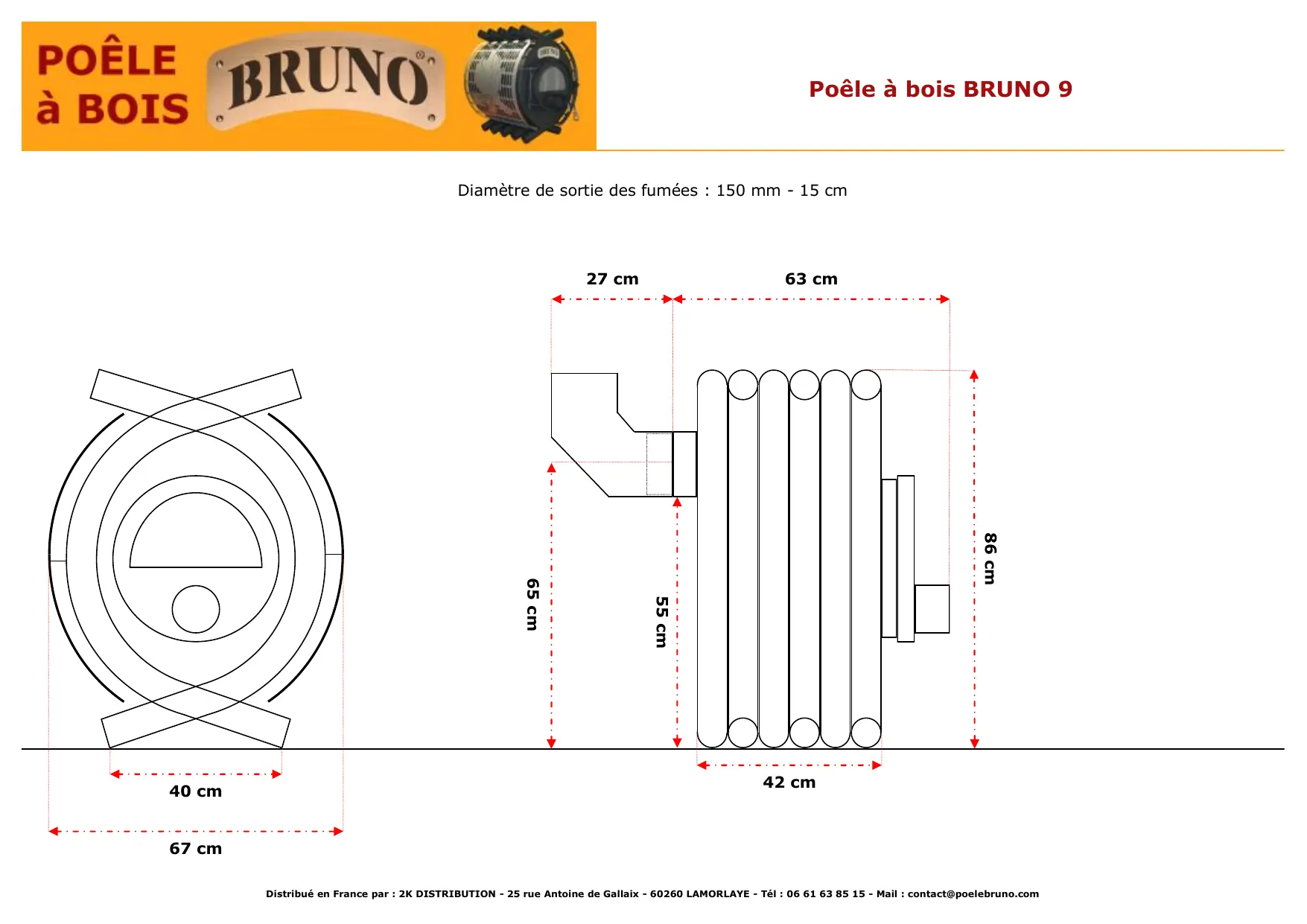 Poêle à bois BRUNO 9 Diamètre de sortie des fumées : 150 mm - 15 cm 27 cm 86 cm 55 cm 65 cm 40 cm 63 cm 42 cm 67 cm Distribué en France par : 2K DISTRIBUTION - 25 rue Antoine de Gallaix - 60260 LAMORLAYE - Tél : 06 61 63 85 15 - Mail : contact@poelebruno.com Poêle à bois BRUNO 12 Diamètre de sortie des fumées : 150 mm - 15 cm 27 cm 86 cm 55 cm 65 cm 40 cm 77 cm 56 cm 67 cm Distribué en France par : 2K DISTRIBUTION - 25 rue Antoine de Gallaix - 60260 LAMORLAYE - Tél : 06 61 63 85 15 - Mail : contact@poelebruno.com Poêle à bois BRUNO 15 Diamètre de sortie des fumées : 150 mm - 15 cm 27 cm 86 cm 55 cm 65 cm 40 cm 91 cm 70 cm 67 cm Distribué en France par : 2K DISTRIBUTION - 25 rue Antoine de Gallaix - 60260 LAMORLAYE - Tél : 06 61 63 85 15 - Mail : contact@poelebruno.com Poêle à bois BRUNO 21 Diamètre de sortie des fumées : 150 mm - 15 cm 27 cm 86 cm 55 cm 65 cm 40 cm 119 cm 98 cm 59 cm Distribué en France par : 2K DISTRIBUTION - 25 rue Antoine de Gallaix - 60260 LAMORLAYE - Tél : 06 61 63 85 15 - Mail : contact@poelebruno.com Poêle à bois BRUNO 9 Cuisson Diamètre de sortie des fumées : 150 mm - 15 cm 27 cm 63 cm 42 cm 73 cm 51 cm 61 cm 73 cm 58 cm 42 cm Distribué en France par : 2K DISTRIBUTION - 25 rue Antoine de Gallaix - 60260 LAMORLAYE - Tél : 06 61 63 85 15 - Mail : contact@poelebruno.com Poêle à bois BRUNO 12 Cuisson Diamètre de sortie des fumées : 150 mm - 15 cm 27 cm 77 cm 42 cm 73 cm 51 cm 61 cm 73 cm 58 cm 56 cm Distribué en France par : 2K DISTRIBUTION - 25 rue Antoine de Gallaix - 60260 LAMORLAYE - Tél : 06 61 63 85 15 - Mail : contact@poelebruno.com Poêle à bois BRUNO 15 Cuisson Diamètre de sortie des fumées : 150 mm - 15 cm 27 cm 91 cm 42 cm 73 cm 51 cm 61 cm 73 cm 58 cm 70 cm Distribué en France par : 2K DISTRIBUTION - 25 rue Antoine de Gallaix - 60260 LAMORLAYE - Tél : 06 61 63 85 15 - Mail : contact@poelebruno.com