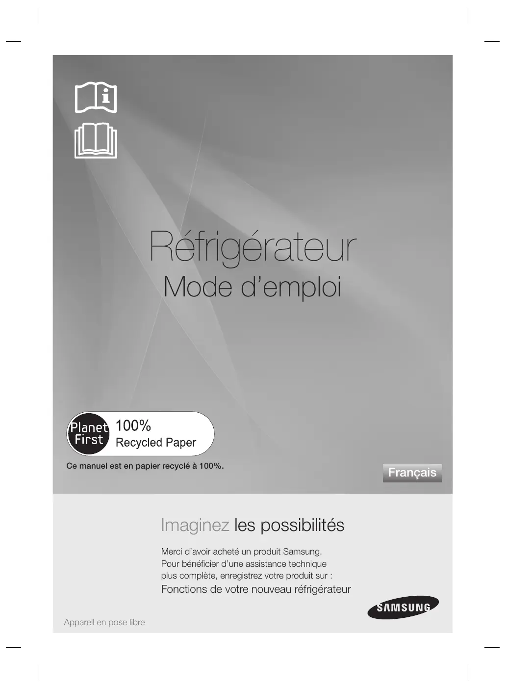 • Utilisez cet appareil uniquement dans le but pour lequel il a été conçu, conformément aux instructions de ce mode d’emploi. Cet appareil ne doit pas être utilisé par des personnes (y compris des enfants) dont les capacités physiques, sensorielles ou mentales sont diminuées ou qui n’ont pas l’expérience ou les connaissances nécessaires, sauf si elles sont placées sous la surveillance d’une personne responsable de leur sécurité ou si cette personne leur a communiqué les instructions nécessaires pour utiliser le réfrigérateur. • Les avertissements et les importantes consignes de sécurité figurant dans ce mode d’emploi ne couvrent pas toutes les conditions et situations qui peuvent éventuellement se présenter. Il vous incombe de faire preuve de bon sens, de vigilance et de précaution lors de l’installation, de la maintenance et de l’utilisation de votre réfrigérateur. • Les consignes d’utilsation suivantes étant communes à plusieurs modèles, les caractéristiques de votre réfrigérateur peuvent légèrement différer de celles décrites dans le présent mode d’emploi et il est possible que certains pictogrammes ne s’appliquent pas à votre appareil. Si vous avez des questions ou des problèmes, contactez votre centre technique le plus proche ou consultez le site www.samsung.com pour toute aide et information.