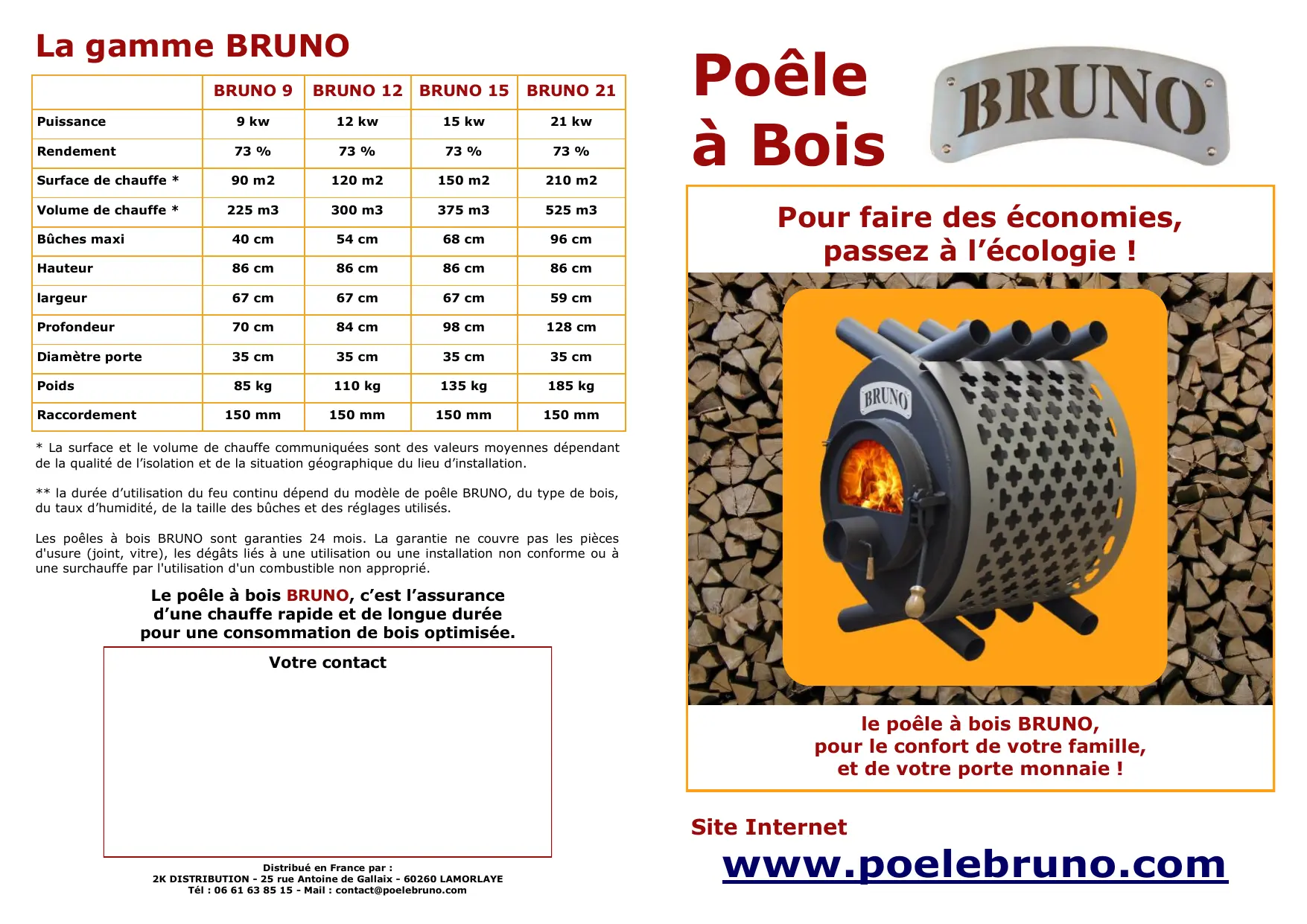 - La surface et le volume de chauffe communiquées sont des valeurs moyennes dépendant de la qualité de l’isolation et de la situation géographique du lieu d’installation. ** la durée d’utilisation du feu continu dépend du modèle de poêle BRUNO, du type de bois, du taux d’humidité, de la taille des bûches et des réglages utilisés. Les poêles à bois BRUNO sont garanties 24 mois. La garantie ne couvre pas les pièces d'usure (joint, vitre), les dégâts liés à une utilisation ou une installation non conforme ou à une surchauffe par l'utilisation d'un combustible non approprié. Le poêle à bois BRUNO, c’est l’assurance d’une chauffe rapide et de longue durée pour une consommation de bois optimisée. Votre contact le poêle à bois BRUNO, pour le confort de votre famille, et de votre porte monnaie ! Site Internet Distribué en France par : 2K DISTRIBUTION - 25 rue Antoine de Gallaix - 60260 LAMORLAYE Tél : 06 61 63 85 15 - Mail : contact@poelebruno.com www.poelebruno.com Le principe de fonctionnement Grâce à son aptitude à brûler tout type de bois non traité, le poêle à bois BRUNO diffuse de manière rapide la chaleur aux tubulures qui entoure son corps de chauffe. Naturellement, l'air froid, capté par le bas du poêle, est réchauffé pour être évacué par le haut. Ce principe physique, sans aucune aide mécanique ou électrique, garantit un fonctionnement linéaire, rapide et fiable. Dès les premières minutes, le poêle à bois BRUNO commence à réchauffer l'air ambiant, sans avoir besoin d'attendre des heures comme les poêles à bois de masse. De plus, son système à double combustion assure un rendement jusqu’à 73%, ce qui est très largement supérieur à celui d'une cheminée qui atteint une valeur faible de seulement 10%. Poêle à bois BRUNO 9 Le petit modèle BRUNO possède déjà une capacité de chauffe généreuse pour des volumes plus restreints. Acceptant des bûches jusqu’à 40 cm, il saura, grâce à ses faibles dimensions, trouvé sa place au sein de votre habitation. Poêle à bois BRUNO 12 Poêle à bois BRUNO 15 Grâce à son foyer de capacité importante, le poêle à bois BRUNO permet un feu en continu jusqu'à 8-10 heures d'autonomie, selon le modèle. Ainsi, après avoir chargé le soir, il permet de retrouver le lendemain matin suffisamment de braise pour relancer le feu sans avoir besoin de le rallumer**. Le modèle le plus représentatif de la gamme BRUNO dispose d’une puissance de chauffe très importante pour des habitations aux volumes importants. De plus, il accepte des bûches jusqu’à 68 cm de longueur. Grâce à son volet de commande de l'air, le poêle à bois BRUNO permet un parfait contrôle de la puissance de fonctionnement : ouvert pour un feu vif permettant ainsi de réchauffer rapidement votre habitation jusqu'à réduit pour la maintenir à température voulue. Le poêle à bois BRUNO, c'est une grande simplicité d'utilisation pour une puissance de chauffe importante. Bûches de 54 cm Le modèle phare de la gamme BRUNO, adapté à tous les volumes, avec une puissance de chauffe importante, pour tout type d’habitation, moderne ou ancienne. Acceptant des bûches jusqu’à 54 cm, il s’intégrera avec efficacité dans votre intérieur. L’utilisation Grâce à son système à double combustion interne, le poêle à bois BRUNO permet de réduire la production de cendres. Il ne nécessite que très peu de décendrage et surtout jamais de manière complet. En effet, pour un fonctionnement optimal, il est nécessaire de toujours conserver un lit de cendres au fond du poêle à bois. Rendement 73 % Poêle à bois BRUNO 21 environs 150 m2 * Bûches de 96 cm Le plus grand modèle de la gamme BRUNO dispose d’une puissance de chauffe très importante, parfaitement adaptée aux grands volumes tel que ferme, loft, atelier d’artiste, gite, etc... Tous les poêles BRUNO sont livrés avec une porte en verre pour le contrôle de la chauffe, des grilles de protection, un bac à cendre ainsi qu’un racloir à cendre. Le BRUNO 21 est livré sans de grille de protection. Plus d’informations et de photos sur notre site Internet : www.poelebruno.com Version Cuisson La gamme des poêles BRUNO dispose du certificat européen EN 13240 et sont éligibles au crédit d’impôt 2009.