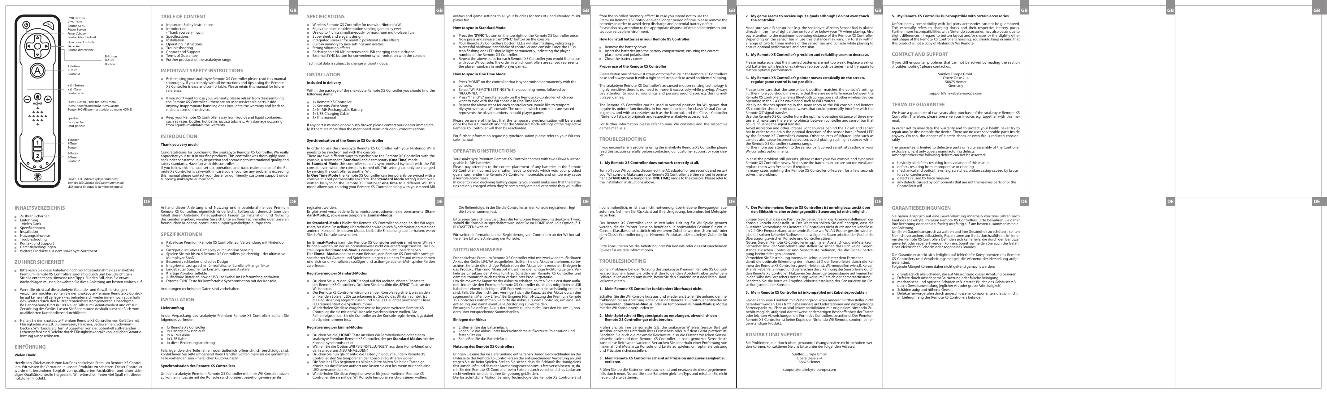 Synchronisation de la Premium Remote XS Comment synchroniser en mode temporaire : Inclus dans la livraison Player-LED (Indicates player numbers) Betriebs-LED (Zeigen die Spielernummer an) LED joueur (Indique le nombre de joueur) Veuillez prendre note du fait que la synchronisation temporaire sera effacée une fois que la console Wii sera hors tension. Les paramètres de la manette installée en standard seront réactivés. Appuyez une fois sur la touche „SYNC „ sur l’ avant droit de votre Premium Remote XS. Maintenant, appuyez sur la touche „SYNC“ de la console. Les LED de votre Premium Remote XS se mettent à clignoter, ce qui indique que la synchronisation a fonctionné. Une fois que les voyants cessent de clignoter définitivement, ils indiquent le nombre de joueurs sur la Premium Remote XS. Répéter les étapes ci-dessus pour chaque Premium Remote XS que vous souhaitez utiliser avec votre console de Wii . L‘ordre dans lequel les contrôleurs sont synchronisés seront représenté par un numéro dans les jeux. INSTALLATON Maintenir votre Premium Remote XS Snakebyte hors de portée de tous liquides et récipients contenant un liquide tel que des vases, des bouteilles, des bains chauds, des jacuzzis, etc. Tout dommage produit par un liquide annulerait la garantie. Si une partie de ces éléments est manquante, ou évidemment cassée, merci de contacter votre revendeur immédiatement. S‘il y a plus d’articles que mentionnés précédemment, félicitations ! Comment synchroniser en mode standard : Les données techniques peuvent être modifiées sans préavis.