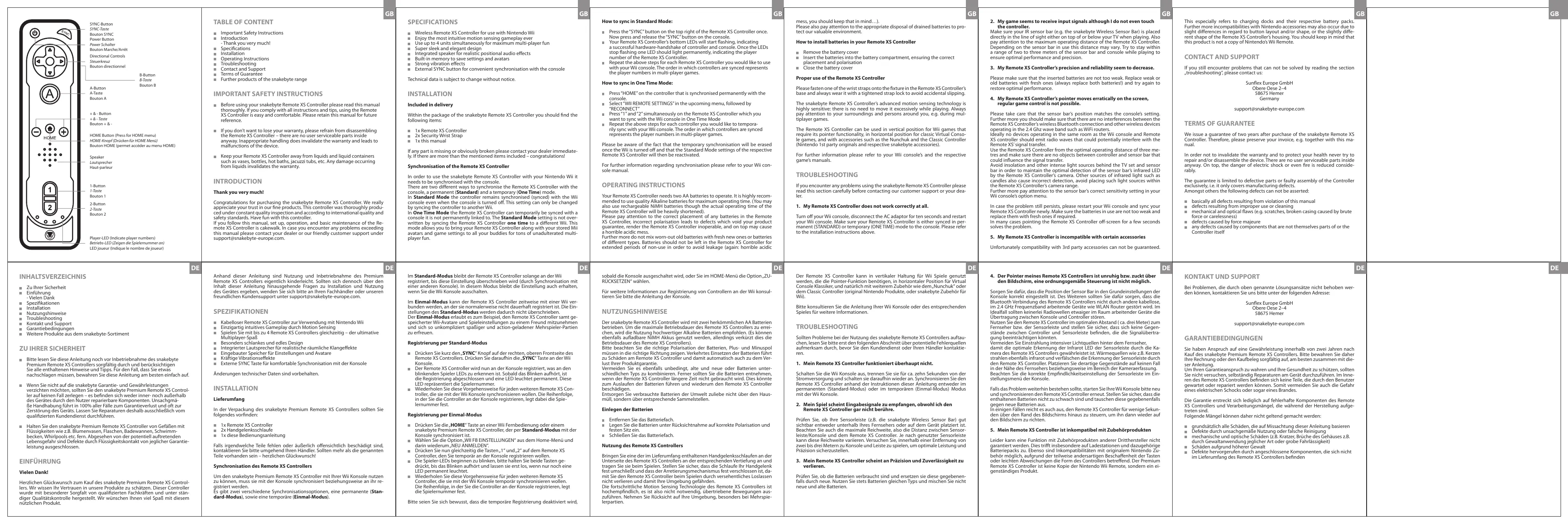 SYNC-Button SYNC-Taste Bouton SYNC Power Button Power Schalter Bouton Marche/Arrêt Instruction importante de sécurité Introduction - Merci beaucoup ! Spécifications Installation Mode d‘emploi Dépannage Contact et assistance Conditions de garantie Autres produits de la gamme Snakebyte Directional Controls Steuerkreuz Bouton directionnel A-Button A-Taste Bouton A B-Button B-Taste Bouton B HOME Button (Press for HOME menu) HOME-Knopf (Drücken für HOME Menü) Bouton HOME (permet accéder au menu HOME) Speaker Lautsprecher Haut-parleur Si vous ne voulez pas perdre votre garantie, merci de vous abstenir d’ouvrir votre Remote XS Snakebyte. De toute façon, il n‘y a aucune pièce utilisable à l‘intérieur. Une manipulation inadéquate peut entrainer l’annulation de la garantie et risque de mener le produit à sa destruction. Par conséquent, toutes les réparations doivent être exclusivement effectuées par le service client. 1-Button 1-Taste Bouton 1 1 x Remote XS 2 x dragonnes de sécurité 1 x ce manuel