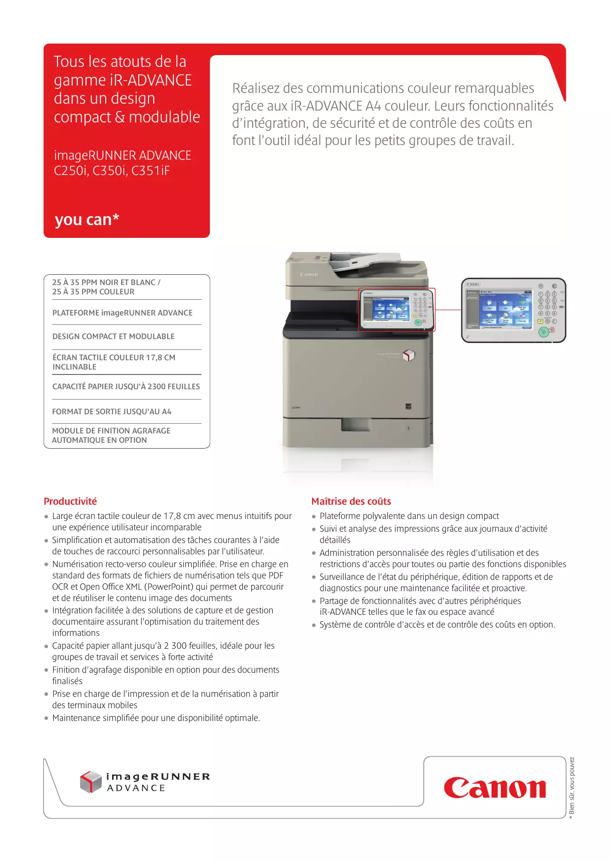 Tous les atouts de la gamme iR-ADVANCE dans un design compact & modulable imageRUNNER ADVANCE C250i, C350i, C351iF Réalisez des communications couleur remarquables grâce aux iR-ADVANCE A4 couleur. Leurs fonctionnalités d’intégration, de sécurité et de contrôle des coûts en font l’outil idéal pour les petits groupes de travail. you can*