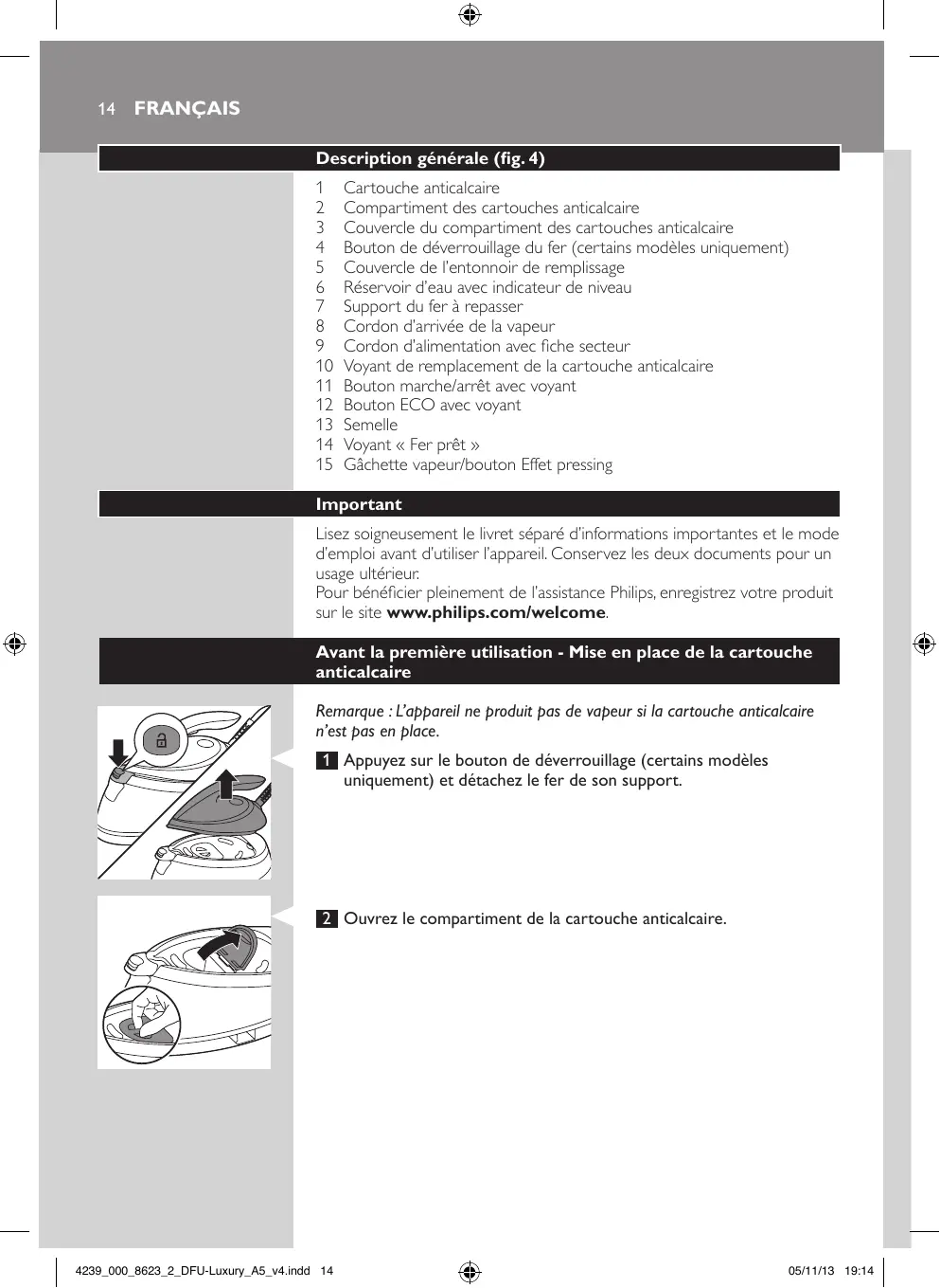 Lisez soigneusement le livret séparé d’informations importantes et le mode d’emploi avant d’utiliser l’appareil. Conservez les deux documents pour un usage ultérieur. Pour bénéficier pleinement de l’assistance Philips, enregistrez votre produit sur le site www.philips.com/welcome. Avant la première utilisation - Mise en place de la cartouche anticalcaire Remarque : L’appareil ne produit pas de vapeur si la cartouche anticalcaire n’est pas en place. 1 Appuyez sur le bouton de déverrouillage (certains modèles uniquement) et détachez le fer de son support.
