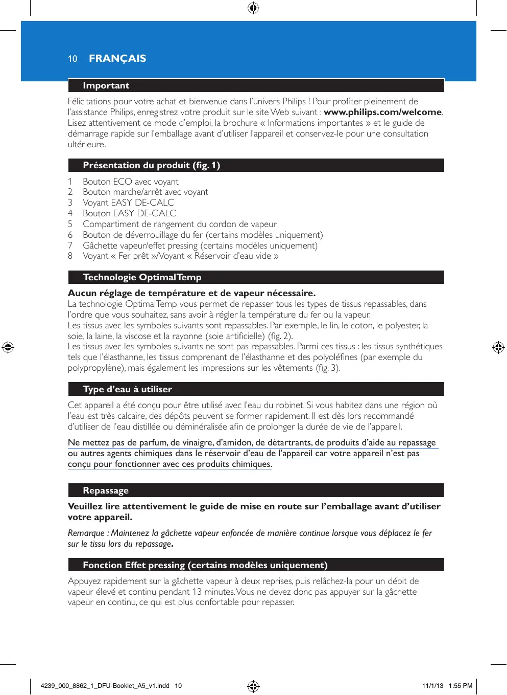 La technologie OptimalTemp vous permet de repasser tous les types de tissus repassables, dans l’ordre que vous souhaitez, sans avoir à régler la température du fer ou la vapeur. Les tissus avec les symboles suivants sont repassables. Par exemple, le lin, le coton, le polyester, la soie, la laine, la viscose et la rayonne (soie artificielle) (fig. 2). Les tissus avec les symboles suivants ne sont pas repassables. Parmi ces tissus : les tissus synthétiques tels que l’élasthanne, les tissus comprenant de l’élasthanne et des polyoléfines (par exemple du polypropylène), mais également les impressions sur les vêtements (fig. 3). Type d’eau à utiliser Cet appareil a été conçu pour être utilisé avec l’eau du robinet. Si vous habitez dans une région où l’eau est très calcaire, des dépôts peuvent se former rapidement. Il est dès lors recommandé d’utiliser de l’eau distillée ou déminéralisée afin de prolonger la durée de vie de l’appareil. Ne mettez pas de parfum, de vinaigre, d’amidon, de détartrants, de produits d’aide au repassage ou autres agents chimiques dans le réservoir d’eau de l’appareil car votre appareil n’est pas conçu pour fonctionner avec ces produits chimiques. Repassage Veuillez lire attentivement le guide de mise en route sur l’emballage avant d’utiliser votre appareil. Remarque : Maintenez la gâchette vapeur enfoncée de manière continue lorsque vous déplacez le fer sur le tissu lors du repassage. Fonction Effet pressing (certains modèles uniquement) Appuyez rapidement sur la gâchette vapeur à deux reprises, puis relâchez-la pour un débit de vapeur élevé et continu pendant 13 minutes. Vous ne devez donc pas appuyer sur la gâchette vapeur en continu, ce qui est plus confortable pour repasser.