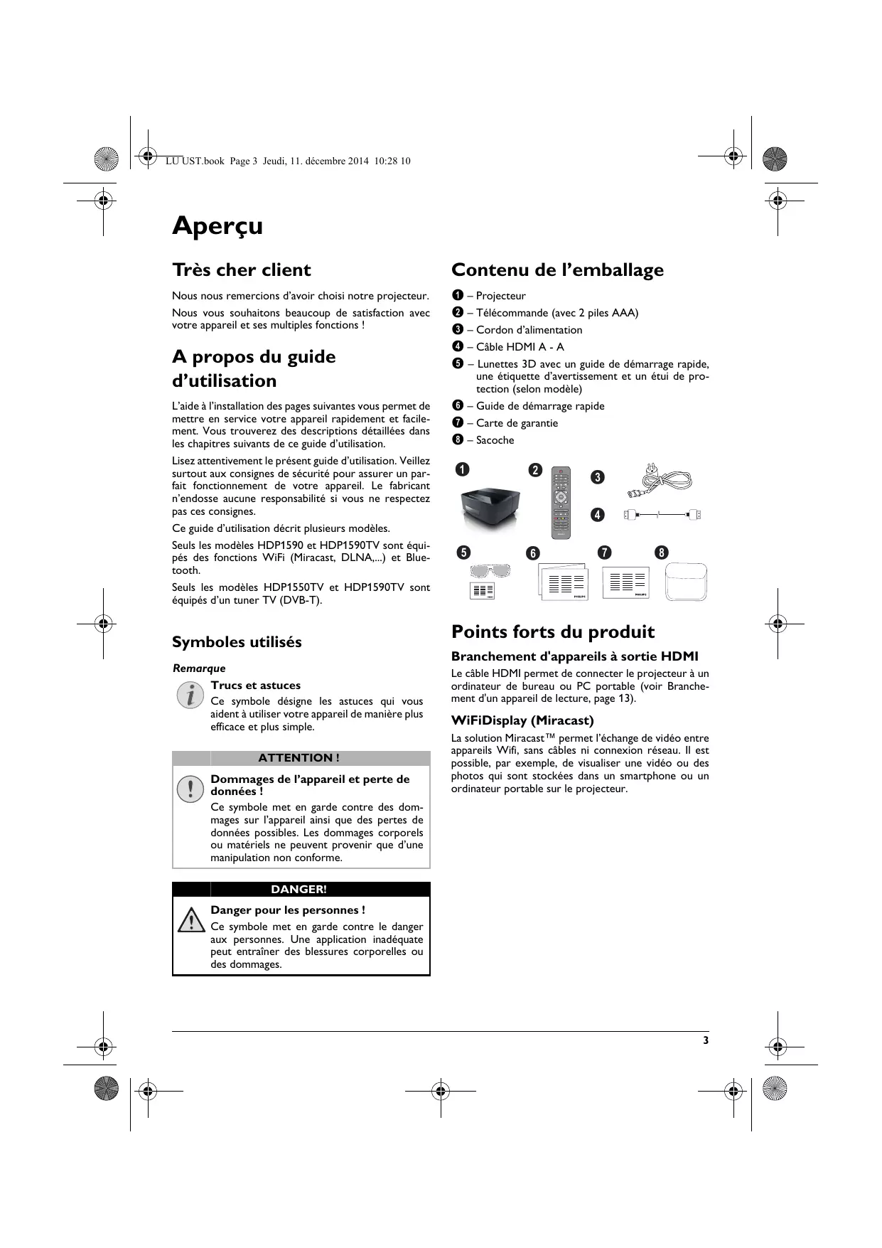 Philips · HDP15x0 & HDP15x0TV LU UST.book Page 3 Jeudi, 11. décembre 2014 10:28 10 Aperçu Très cher client Contenu de l’emballage Nous nous remercions d’avoir choisi notre projecteur. Nous vous souhaitons beaucoup de satisfaction avec votre appareil et ses multiples fonctions ! 1 – Projecteur 2 – Télécommande (avec 2 piles AAA) 3 – Cordon d’alimentation 4 – Câble HDMI A - A 5 – Lunettes 3D avec un guide de démarrage rapide, une étiquette d’avertissement et un étui de protection (selon modèle) 6 – Guide de démarrage rapide 7 – Carte de garantie 8 – Sacoche A propos du guide d’utilisation L’aide à l’installation des pages suivantes vous permet de mettre en service votre appareil rapidement et facilement. Vous trouverez des descriptions détaillées dans les chapitres suivants de ce guide d’utilisation. Lisez attentivement le présent guide d’utilisation. Veillez surtout aux consignes de sécurité pour assurer un parfait fonctionnement de votre appareil. Le fabricant n’endosse aucune responsabilité si vous ne respectez pas ces consignes. Ce guide d’utilisation décrit plusieurs modèles. Seuls les modèles HDP1590 et HDP1590TV sont équipés des fonctions WiFi (Miracast, DLNA,...) et Bluetooth. Seuls les modèles HDP1550TV et HDP1590TV sont équipés d’un tuner TV (DVB-T). Symboles utilisés