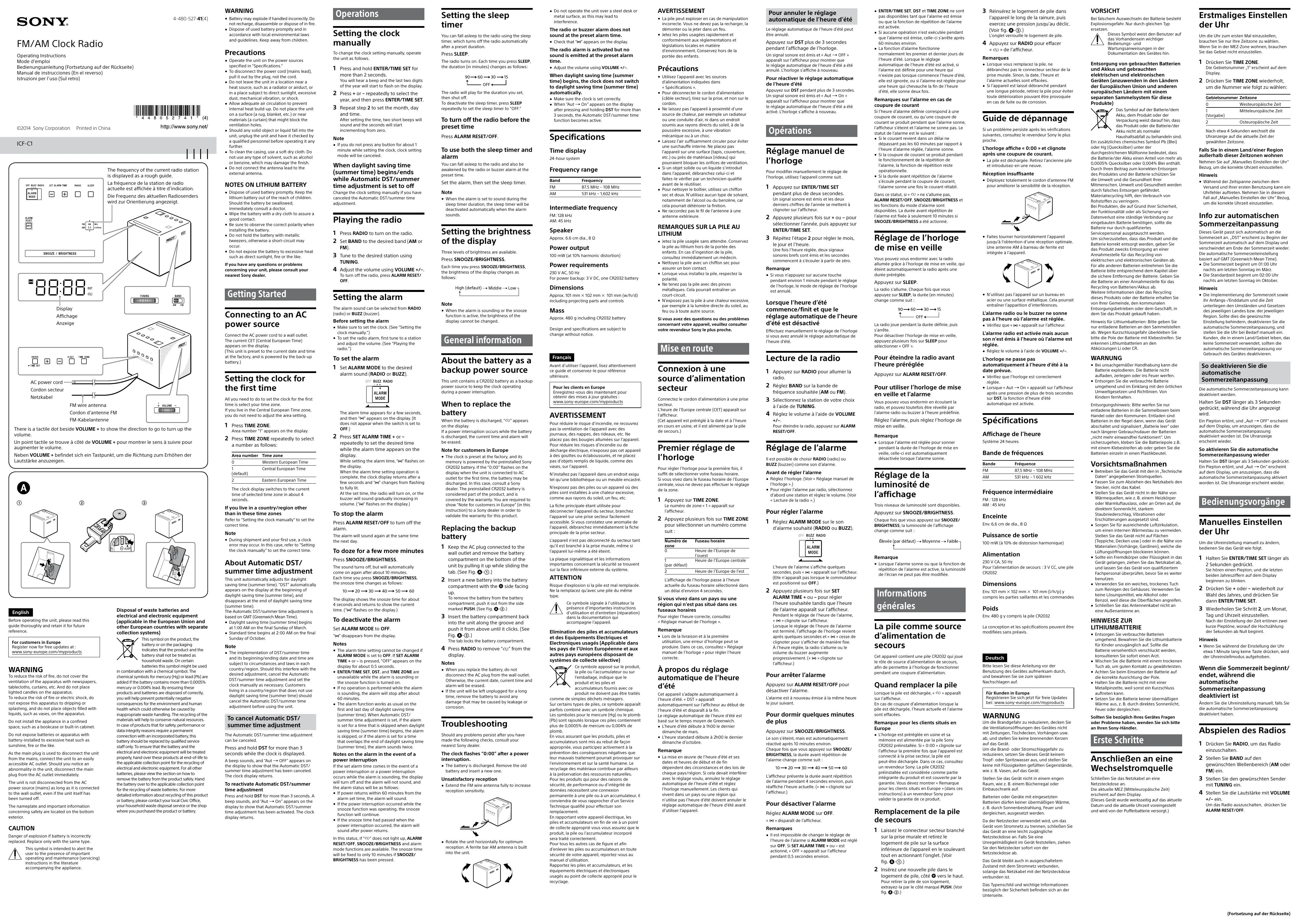 Si vous vivez dans un pays ou une région qui n’est pas situé dans ces fuseaux horaires Remarque Lors de la livraison et à la première utilisation, une erreur d’horloge peut se produire. Dans ce cas, consultez « Réglage manuel de l’horloge » pour régler l’heure correcte. Cet appareil s’adapte automatiquement à l’heure d’été. « DST » apparaît automatiquement sur l’afficheur au début de l’heure d’été et disparaît à la fin. Le réglage automatique de l’heure d’été est basé sur le temps moyen de Greenwich. L’heure d’été débute à 1h00 le dernier dimanche de mars. L’heure standard débute à 2h00 le dernier dimanche d’octobre. Remarque La mise en œuvre de l’heure d’été et ses dates et heures de début et de fin dépendent des circonstances et des lois de chaque pays/région. Si cela devait interférer avec le réglage voulu, annulez le réglage automatique de l’heure d’été et réglez l’horloge manuellement. Les clients qui vivent dans un pays ou une région qui n’utilise pas l’heure d’été doivent annuler le réglage automatique de l’heure d’été avant d’utiliser l’appareil. Appuyez plusieurs fois sur SET ALARM TIME + ou – pour régler l’heure souhaitée tandis que l’heure de l’alarme apparaît sur l’afficheur. Pendant le réglage de l’heure de l’alarme, » clignote sur l’afficheur. Lorsque le réglage de l’heure de l’alarme est terminé, l’affichage de l’horloge revient » cesse de après quelques secondes et « clignoter pour s’afficher de manière fixe. À l’heure réglée, la radio s’allume ou le volume du buzzer augmente » clignote sur progressivement. (« l’afficheur.) Pour régler l’heure correcte, consultez « Réglage manuel de l’horloge ». À propos du réglage automatique de l’heure d’été Remarques Lorsque vous remplacez la pile, ne débranchez pas le connecteur secteur de la prise murale. Sinon, la date, l’heure et l’alarme actuelles sont effacées. Si l’appareil est laissé débranché pendant une longue période, retirez la pile pour éviter toute détérioration pouvant être provoquée en cas de fuite ou de corrosion. Guide de dépannage Si un problème persiste après les vérifications suivantes, consultez le revendeur Sony le plus proche. L’horloge affiche « 0:00 » et clignote après une coupure de courant. La pile est déchargée. Retirez l’ancienne pile et introduisez-en une neuve. Réception insuffisante Déployez totalement le cordon d’antenne FM pour améliorer la sensibilité de la réception. Faites tourner horizontalement l’appareil jusqu’à l’obtention d’une réception optimale. Une antenne AM à barreau de ferrite est intégrée à l’appareil. N’utilisez pas l’appareil sur un bureau en acier ou une surface métallique. Cela pourrait entraîner l’apparition d’interférences. » apparaît sur l’afficheur. Vérifiez que « L’alarme radio est activée mais aucun son n’est émis à l’heure où l’alarme est réglée. Réglez le volume à l’aide de VOLUME +/–. L’horloge ne passe pas automatiquement à l’heure d’été à la date prévue. Vérifiez que l’horloge est correctement réglée. Lorsque « Aut On » apparaît sur l’afficheur après une pression de plus de trois secondes sur DST, la fonction d’heure d’été automatique est activée. Pour arrêter l’alarme Appuyez sur ALARM RESET/OFF pour désactiver l’alarme. L’alarme est à nouveau émise à la même heure le jour suivant. Pour dormir quelques minutes de plus Appuyez sur SNOOZE/BRIGHTNESS. Le son s’éteint, mais est automatiquement réactivé après 10 minutes environ. Chaque fois que vous appuyez sur SNOOZE/ BRIGHTNESS, la durée avant répétition de l’alarme change comme suit : L’afficheur présente la durée avant répétition de l’alarme pendant 4 secondes environ, puis » clignote sur réaffiche l’heure actuelle. (« l’afficheur.) Pour désactiver l’alarme Réglez ALARM MODE sur OFF.