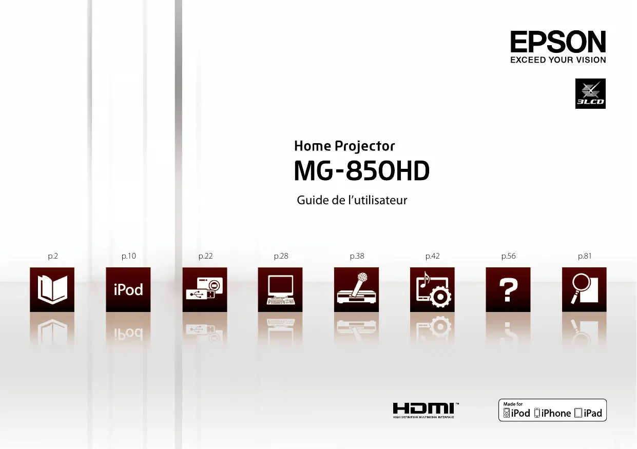 Avis général iPad, iPhone, iPod, iPod nano, and iPod touch are trademarks of Apple Inc. , registered in the U.S. and other countries. Apple, iTunes, and Mac OS are trademarks of Apple Inc. Microsoft, Windows, Windows Vista, PowerPoint et le logo Windows sont des marques commerciales ou déposées de Microsoft Corporation aux États-Unis et/ou dans d'autres pays. HDMI et High-Definition Multimedia Interface sont des marques commerciales ou déposées de HDMI Licensing LLC. Les autres noms de produits cités dans le présent manuel sont donnés à titre d’information uniquement et lesdits produits peuvent constituer des marques de leur propriétaire respectif. Epson décline tout droit quant à ces produits. ©SEIKO EPSON CORPORATION 2011. All rights reserved.