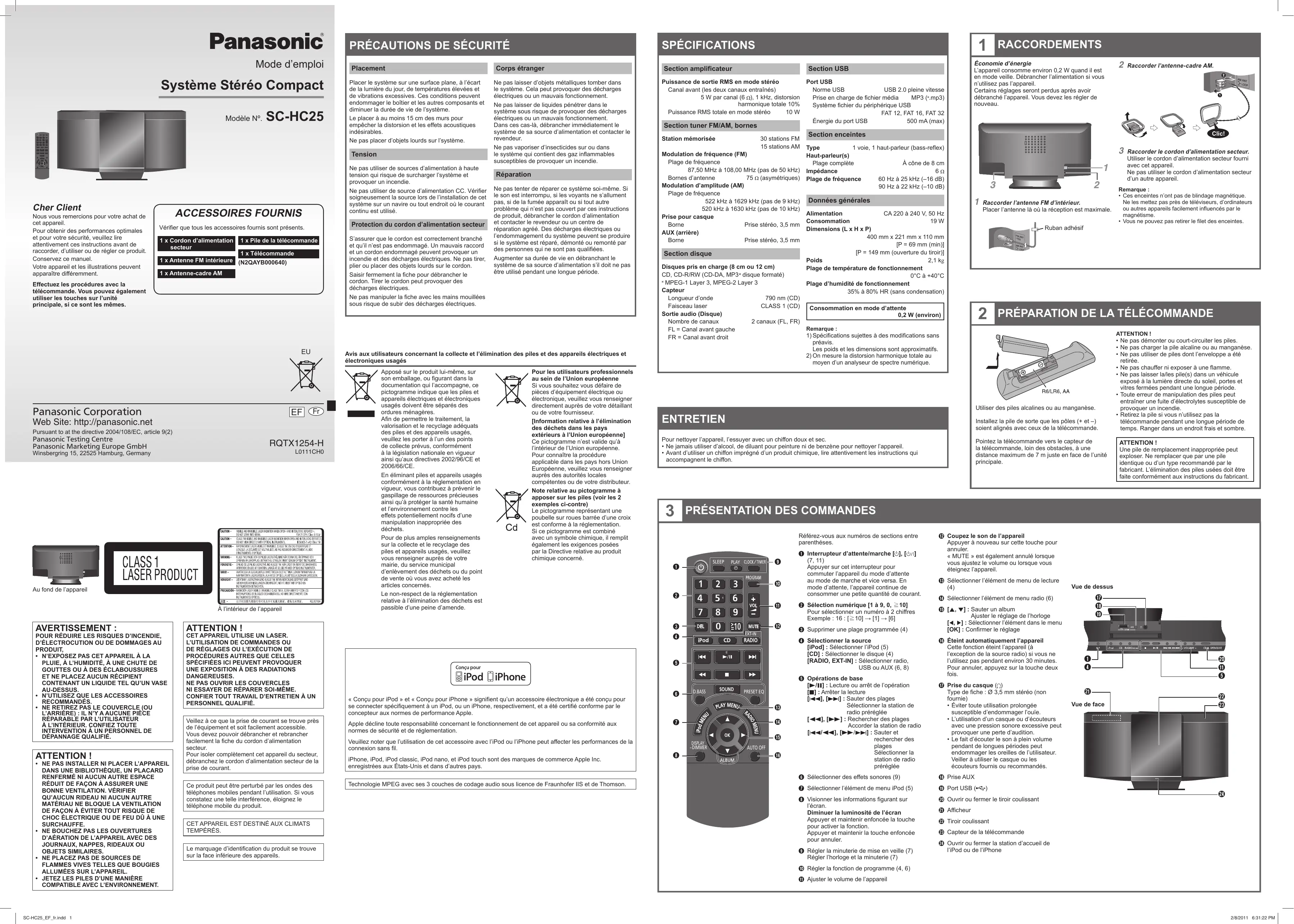 - JETEZ LES PILES D’UNE MANIÈRE COMPATIBLE AVEC L’ENVIRONNEMENT. SC-HC25_EF_fr.indd 1 Corps étranger Ne pas laisser d’objets métalliques tomber dans le système. Cela peut provoquer des décharges électriques ou un mauvais fonctionnement. Ne pas laisser de liquides pénétrer dans le système sous risque de provoquer des décharges électriques ou un mauvais fonctionnement. Dans ces cas-là, débrancher immédiatement le système de sa source d’alimentation et contacter le revendeur. Ne pas vaporiser d’insecticides sur ou dans le système qui contient des gaz inflammables susceptibles de provoquer un incendie. Réparation Ne pas tenter de réparer ce système soi-même. Si le son est interrompu, si les voyants ne s’allument pas, si de la fumée apparaît ou si tout autre problème qui n’est pas couvert par ces instructions de produit, débrancher le cordon d’alimentation et contacter le revendeur ou un centre de réparation agréé. Des décharges électriques ou l’endommagement du système peuvent se produire si le système est réparé, démonté ou remonté par des personnes qui ne sont pas qualifiées. Augmenter sa durée de vie en débranchant le système de sa source d’alimentation s’il doit ne pas être utilisé pendant une longue période. Section amplificateur Section USB Puissance de sortie RMS en mode stéréo Canal avant (les deux canaux entraînés) 5 W par canal (6 ), 1 kHz, distorsion harmonique totale 10% Puissance RMS totale en mode stéréo 10 W Section tuner FM/AM, bornes Station mémorisée 30 stations FM 15 stations AM Modulation de fréquence (FM) Plage de fréquence 87,50 MHz à 108,00 MHz (pas de 50 kHz) Bornes d’antenne 75 (asymétriques) Modulation d’amplitude (AM) Plage de fréquence 522 kHz à 1629 kHz (pas de 9 kHz) 520 kHz à 1630 kHz (pas de 10 kHz) Prise pour casque Borne Prise stéréo, 3,5 mm AUX (arrière) Borne Prise stéréo, 3,5 mm Section disque Disques pris en charge (8 cm ou 12 cm) CD, CD-R/RW (CD-DA, MP3 disque formaté) MPEG-1 Layer 3, MPEG-2 Layer 3 Capteur Longueur d’onde 790 nm (CD) Faisceau laser CLASS 1 (CD) Sortie audio (Disque) Nombre de canaux 2 canaux (FL, FR) FL = Canal avant gauche FR = Canal avant droit Avis aux utilisateurs concernant la collecte et l’élimination des piles et des appareils électriques et électroniques usagés Au fond de l’appareil