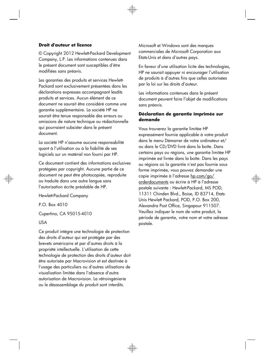 Microsoft et Windows sont des marques commerciales de Microsoft Corporation aux Etats-Unis et dans d'autres pays. En faveur d’une utilisation licite des technologies, HP ne saurait appuyer ni encourager l’utilisation de produits à d’autres fins que celles autorisées par la loi sur les droits d’auteur. Les informations contenues dans le présent document peuvent faire l’objet de modifications sans préavis. Déclaration de garantie imprimée sur demande Vous trouverez la garantie limitée HP expressément fournie applicable à votre produit dans le menu Démarrer de votre ordinateur et/ ou dans le CD/DVD livré dans la boîte. Dans certains pays ou régions, une garantie limitée HP imprimée est livrée dans la boîte. Dans les pays ou régions où la garantie n'est pas fournie sous forme imprimée, vous pouvez demander une copie imprimée à l'adresse hp.com/go/ orderdocuments ou écrire à HP à l'adresse postale suivante : Hewlett-Packard, MS POD, 11311 Chinden Blvd., Boise, ID 83714, EtatsUnis Hewlett Packard, POD, P.O. Box 200, Alexandra Post Office, Singapour 911507. Veuillez indiquer le nom de votre produit, la période de garantie, votre nom et votre adresse postale.