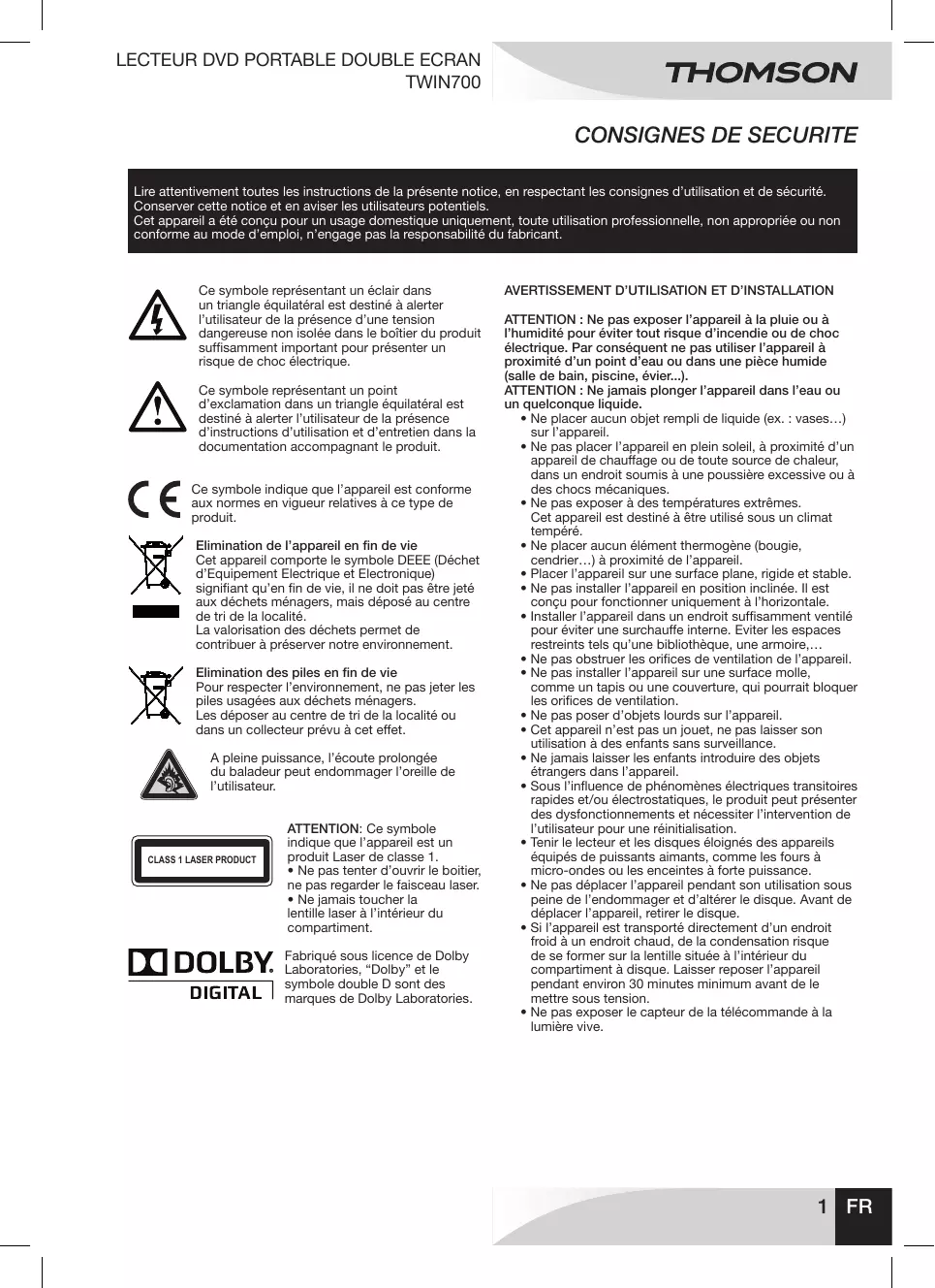 - Ne jamais toucher la lentille laser à l’intérieur du compartiment. Fabriqué sous licence de Dolby Laboratories, “Dolby” et le symbole double D sont des marques de Dolby Laboratories. Avertissement d’utilisation et d’installation ATTENTION : Ne pas exposer l’appareil à la pluie ou à l’humidité pour éviter tout risque d’incendie ou de choc électrique. Par conséquent ne pas utiliser l’appareil à proximité d’un point d’eau ou dans une pièce humide (salle de bain, piscine, évier...). ATTENTION : Ne jamais plonger l’appareil dans l’eau ou un quelconque liquide.