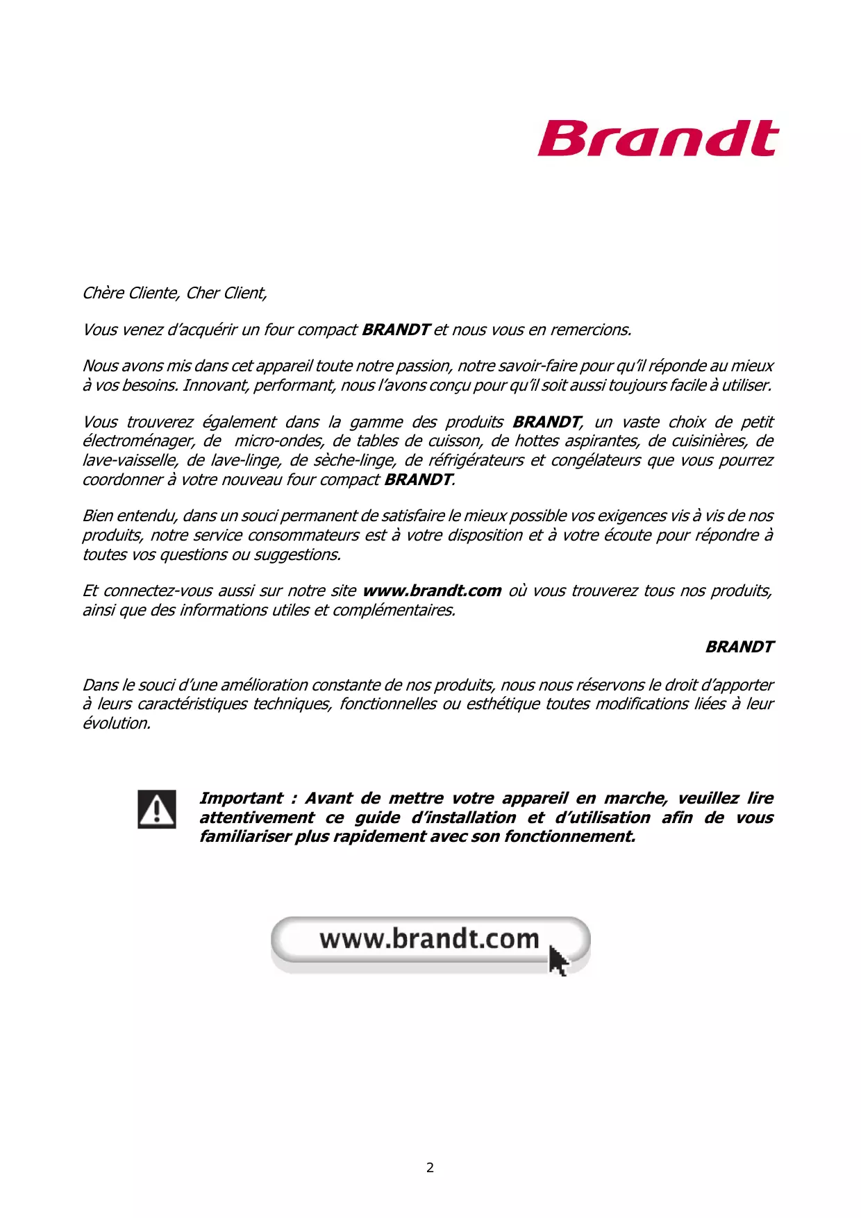 INSTRUCTION MANUAL Four compact 26L Compact oven 26L FC-26MEB FC-26MEW Chère Cliente, Cher Client, Vous venez d’acquérir un four compact BRANDT et nous vous en remercions. Nous avons mis dans cet appareil toute notre passion, notre savoir-faire pour qu’il réponde au mieux à vos besoins. Innovant, performant, nous l’avons conçu pour qu’il soit aussi toujours facile à utiliser. Vous trouverez également dans la gamme des produits BRANDT, un vaste choix de petit électroménager, de micro-ondes, de tables de cuisson, de hottes aspirantes, de cuisinières, de lave-vaisselle, de lave-linge, de sèche-linge, de réfrigérateurs et congélateurs que vous pourrez coordonner à votre nouveau four compact BRANDT. Bien entendu, dans un souci permanent de satisfaire le mieux possible vos exigences vis à vis de nos produits, notre service consommateurs est à votre disposition et à votre écoute pour répondre à toutes vos questions ou suggestions. Et connectez-vous aussi sur notre site www.brandt.com où vous trouverez tous nos produits, ainsi que des informations utiles et complémentaires. BRANDT Dans le souci d’une amélioration constante de nos produits, nous nous réservons le droit d’apporter à leurs caractéristiques techniques, fonctionnelles ou esthétique toutes modifications liées à leur évolution. Important : Avant de mettre votre appareil en marche, veuillez lire attentivement ce guide d’installation et d’utilisation afin de vous familiariser plus rapidement avec son fonctionnement.