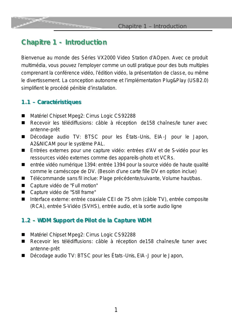 C hap itre 1 - Introd uctio n Bienvenue au monde des Séries VX2000 Video Station d’AOpen. Avec ce produit multimédia, vous pouvez l’employer comme un outil pratique pour des buts multiples comprenant la conférence vidéo, l’édition vidéo, la présentation de classe, ou même le divertissement. La conception autonome et l’implémentation Plug&Play (USB2.0) simplifient le procédé pénible d’installation. 1 .1 – Cara ctérist iq ues n Matériel Chipset Mpeg2: Cirrus Logic CS92288 n Recevoir les télédiffusions: câble à réception de158 chaînes/le tuner avec antenne-prêt n Décodage audio TV: BTSC pour les États-Unis, EIA -J pour le Japon, A2&NICAM pour le système PAL. n Entrées externes pour une capture vidéo: entrées d’AV et de S-vidéo pour les ressources vidéo externes comme des appareils-photo et VCRs. n entrée vidéo numérique 1394: entrée 1394 pour la source vidéo de haute qualité comme le caméscope de DV. (Besoin d’une carte fille DV en option inclue) n Télécommande sans fil inclue: Plage précédente/suivante, Volume haut/bas. n Capture vidéo de "Full motion" n Capture vidéo de "Still frame" n Interface externe: entrée coaxiale CEI de 75 ohm (câble TV), entrée composite (RCA), entrée S-Vidéo (SVHS), entrée audio, et la sortie audio ligne 1 .2 – WDM Sup p ort d e P il ot d e la Ca p ture WDM n Matériel Chipset Mpeg2: Cirrus Logic CS92288 n Recevoir les télédiffusions: câble à réception de158 chaînes/le tuner avec antenne-prêt n Décodage audio TV: BTSC pour les États-Unis, EIA -J pour le Japon,