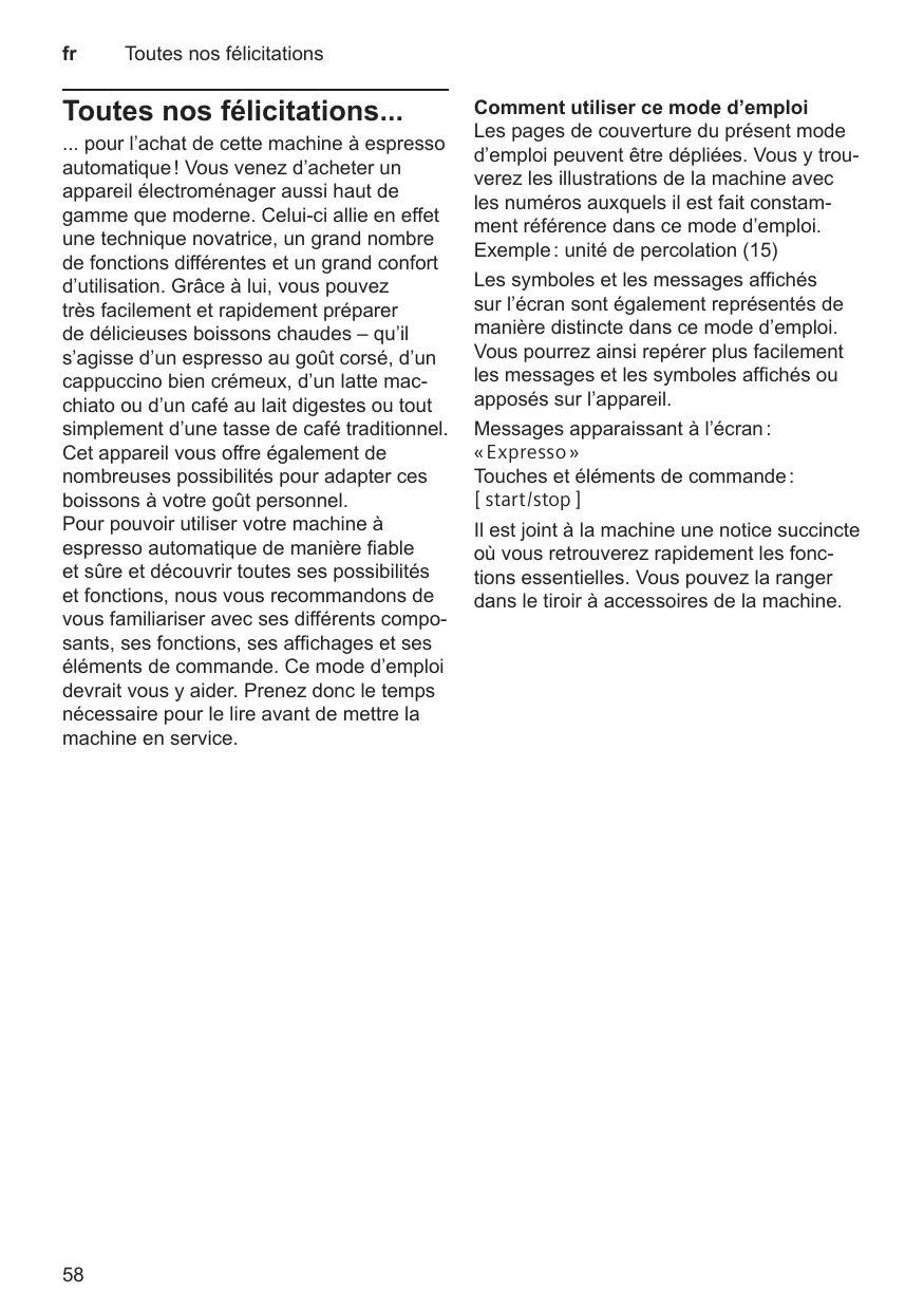 Comment utiliser ce mode d’emploi Les pages de couverture du présent mode d’emploi peuvent être dépliées. Vous y trouverez les illustrations de la machine avec les numéros auxquels il est fait constamment référence dans ce mode d’emploi. Exemple : unité de percolation (15) Les symboles et les messages affichés sur l’écran sont également représentés de manière distincte dans ce mode d’emploi. Vous pourrez ainsi repérer plus facilement les messages et les symboles affichés ou apposés sur l’appareil. Messages apparaissant à l’écran : « Expresso » Touches et éléments de commande : C Il est joint à la machine une notice succincte où vous retrouverez rapidement les fonctions essentielles. Vous pouvez la ranger dans le tiroir à accessoires de la machine.