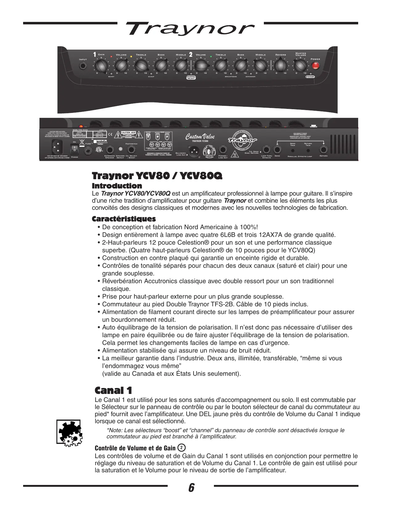DYN Input SPEAKER EMULATOR (PRE-MASTER) Tip: Send Ring: Return Phones / Line Out Loop Thru Effects Send Parallel Effects Loop Return Traynor YCV80 / YCV80Q Introduction Le Traynor YCV80/YCV80Q est un amplificateur professionnel à lampe pour guitare. Il s’inspire d’une riche tradition d’amplificateur pour guitare Traynor et combine les éléments les plus convoités des designs classiques et modernes avec les nouvelles technologies de fabrication. Caractéristiques