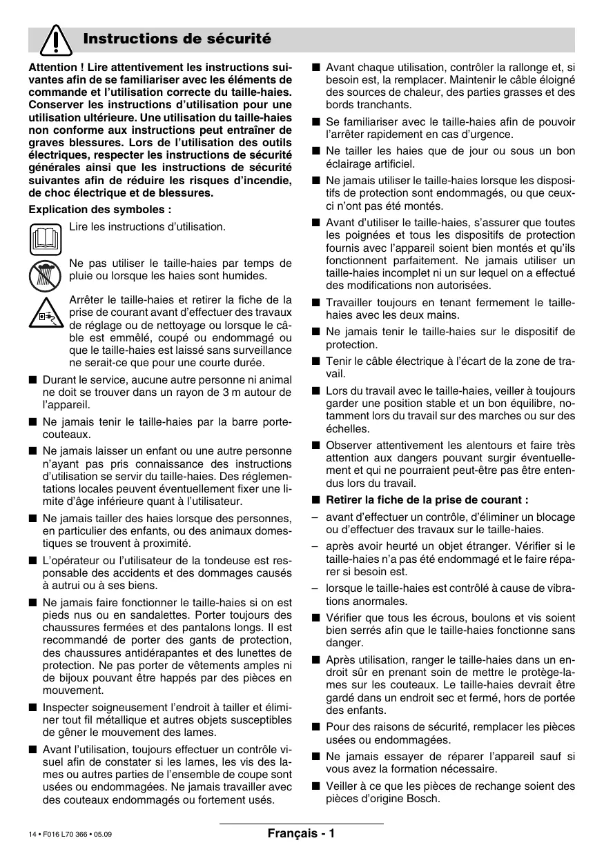 Instructions de sécurité Attention ! Lire attentivement les instructions suivantes afin de se familiariser avec les éléments de commande et l’utilisation correcte du taille-haies. Conserver les instructions d’utilisation pour une utilisation ultérieure. Une utilisation du taille-haies non conforme aux instructions peut entraîner de graves blessures. Lors de l’utilisation des outils électriques, respecter les instructions de sécurité générales ainsi que les instructions de sécurité suivantes afin de réduire les risques d’incendie, de choc électrique et de blessures. Explication des symboles : Lire les instructions d’utilisation. Ne pas utiliser le taille-haies par temps de pluie ou lorsque les haies sont humides. Arrêter le taille-haies et retirer la fiche de la prise de courant avant d’effectuer des travaux de réglage ou de nettoyage ou lorsque le câble est emmêlé, coupé ou endommagé ou que le taille-haies est laissé sans surveillance ne serait-ce que pour une courte durée. ■ Durant le service, aucune autre personne ni animal ne doit se trouver dans un rayon de 3 m autour de l’appareil. ■ Ne jamais tenir le taille-haies par la barre portecouteaux. ■ Ne jamais laisser un enfant ou une autre personne n’ayant pas pris connaissance des instructions d’utilisation se servir du taille-haies. Des réglementations locales peuvent éventuellement fixer une limite d’âge inférieure quant à l’utilisateur. ■ Ne jamais tailler des haies lorsque des personnes, en particulier des enfants, ou des animaux domestiques se trouvent à proximité. ■ L’opérateur ou l’utilisateur de la tondeuse est responsable des accidents et des dommages causés à autrui ou à ses biens. ■ Ne jamais faire fonctionner le taille-haies si on est pieds nus ou en sandalettes. Porter toujours des chaussures fermées et des pantalons longs. Il est recommandé de porter des gants de protection, des chaussures antidérapantes et des lunettes de protection. Ne pas porter de vêtements amples ni de bijoux pouvant être happés par des pièces en mouvement. ■ Inspecter soigneusement l’endroit à tailler et éliminer tout fil métallique et autres objets susceptibles de gêner le mouvement des lames. ■ Avant l’utilisation, toujours effectuer un contrôle visuel afin de constater si les lames, les vis des lames ou autres parties de l’ensemble de coupe sont usées ou endommagées. Ne jamais travailler avec des couteaux endommagés ou fortement usés. 14 • F016 L70 366 • 05.09 ■ Avant chaque utilisation, contrôler la rallonge et, si besoin est, la remplacer. Maintenir le câble éloigné des sources de chaleur, des parties grasses et des bords tranchants. ■ Se familiariser avec le taille-haies afin de pouvoir l’arrêter rapidement en cas d’urgence. ■ Ne tailler les haies que de jour ou sous un bon éclairage artificiel. ■ Ne jamais utiliser le taille-haies lorsque les dispositifs de protection sont endommagés, ou que ceuxci n’ont pas été montés. ■ Avant d’utiliser le taille-haies, s’assurer que toutes les poignées et tous les dispositifs de protection fournis avec l’appareil soient bien montés et qu’ils fonctionnent parfaitement. Ne jamais utiliser un taille-haies incomplet ni un sur lequel on a effectué des modifications non autorisées. ■ Travailler toujours en tenant fermement le taillehaies avec les deux mains. ■ Ne jamais tenir le taille-haies sur le dispositif de protection. ■ Tenir le câble électrique à l’écart de la zone de travail. ■ Lors du travail avec le taille-haies, veiller à toujours garder une position stable et un bon équilibre, notamment lors du travail sur des marches ou sur des échelles. ■ Observer attentivement les alentours et faire très attention aux dangers pouvant surgir éventuellement et qui ne pourraient peut-être pas être entendus lors du travail. ■ Retirer la fiche de la prise de courant : – avant d’effectuer un contrôle, d’éliminer un blocage ou d’effectuer des travaux sur le taille-haies. – après avoir heurté un objet étranger. Vérifier si le taille-haies n’a pas été endommagé et le faire réparer si besoin est. – lorsque le taille-haies est contrôlé à cause de vibrations anormales. ■ Vérifier que tous les écrous, boulons et vis soient bien serrés afin que le taille-haies fonctionne sans danger. ■ Après utilisation, ranger le taille-haies dans un endroit sûr en prenant soin de mettre le protège-lames sur les couteaux. Le taille-haies devrait être gardé dans un endroit sec et fermé, hors de portée des enfants. ■ Pour des raisons de sécurité, remplacer les pièces usées ou endommagées. ■ Ne jamais essayer de réparer l’appareil sauf si vous avez la formation nécessaire. ■ Veiller à ce que les pièces de rechange soient des pièces d’origine Bosch. Français - 1 Caractéristiques techniques Taille-haies Référence Puissance absorbée Nombre de courses à vide Espace inter-couteaux Longueur de coupe Poids Classe de protection Taille-haies Référence Puissance absorbée Nombre de courses à vide Espace inter-couteaux Longueur de coupe Poids Classe de protection 7 Protège-lames 8 Numéro de série Utilisation conforme L’appareil est conçu pour découper et tailler des haies et des buissons dans des jardins domestiques et de plaisance. **différent selon les pays Les accessoires reproduits ou décrits ne sont pas forcément fournis avec la appareil. Pour votre sécurité Introduction Ce manuel contient des indications quant à la manière de monter et d’utiliser correctement le taillehaies. Il est important de lire attentivement ces instructions. Pièces fournies avec l’appareil Retirer avec précaution de l’emballage toutes les pièces de la tronçonneuse à chaîne et vérifier si tous les éléments suivants sont complets : – Taille-haies – Protège-lames – Instructions d’utilisation S’il vous manque des