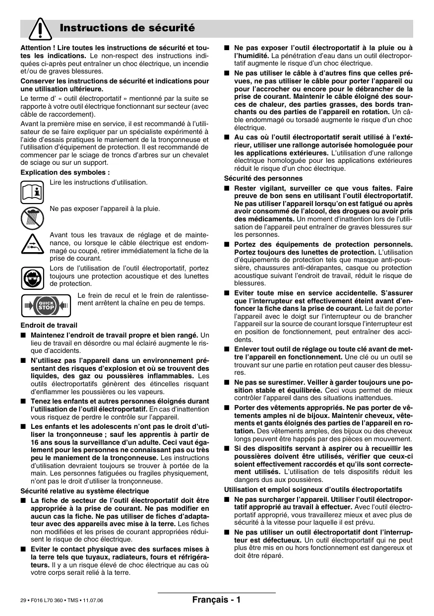■ Ne pas exposer l’outil électroportatif à la pluie ou à l’humidité. La pénétration d’eau dans un outil électroportatif augmente le risque d’un choc électrique. ■ Ne pas utiliser le câble à d’autres fins que celles prévues, ne pas utiliser le câble pour porter l’appareil ou pour l’accrocher ou encore pour le débrancher de la prise de courant. Maintenir le câble éloigné des sources de chaleur, des parties grasses, des bords tranchants ou des parties de l’appareil en rotation. Un câble endommagé ou torsadé augmente le risque d’un choc électrique. ■ Au cas où l’outil électroportatif serait utilisé à l’extérieur, utiliser une rallonge autorisée homologuée pour les applications extérieures. L’utilisation d’une rallonge électrique homologuée pour les applications extérieures réduit le risque d’un choc électrique. Sécurité des personnes ■ Rester vigilant, surveiller ce que vous faites. Faire preuve de bon sens en utilisant l’outil électroportatif. Ne pas utiliser l’appareil lorsqu’on est fatigué ou après avoir consommé de l’alcool, des drogues ou avoir pris des médicaments. Un moment d’inattention lors de l’utilisation de l’appareil peut entraîner de graves blessures sur les personnes. ■ Portez des équipements de protection personnels. Portez toujours des lunettes de protection. L’utilisation d’équipements de protection tels que masque anti-poussière, chaussures anti-dérapantes, casque ou protection acoustique suivant l’endroit de travail, réduit le risque de blessures. ■ Eviter toute mise en service accidentelle. S’assurer que l’interrupteur est effectivement éteint avant d’enfoncer la fiche dans la prise de courant. Le fait de porter l’appareil avec le doigt sur l’interrupteur ou de brancher l’appareil sur la source de courant lorsque l’interrupteur est en position de fonctionnement, peut entraîner des accidents. ■ Enlever tout outil de réglage ou toute clé avant de mettre l’appareil en fonctionnement. Une clé ou un outil se trouvant sur une partie en rotation peut causer des blessures. ■ Ne pas se surestimer. Veiller à garder toujours une position stable et équilibrée. Ceci vous permet de mieux contrôler l’appareil dans des situations inattendues. ■ Porter des vêtements appropriés. Ne pas porter de vêtements amples ni de bijoux. Maintenir cheveux, vêtements et gants éloignés des parties de l’appareil en rotation. Des vêtements amples, des bijoux ou des cheveux longs peuvent être happés par des pièces en mouvement. ■ Si des dispositifs servant à aspirer ou à recueillir les poussières doivent être utilisés, vérifier que ceux-ci soient effectivement raccordés et qu’ils sont correctement utilisés. L’utilisation de tels dispositifs réduit les dangers dus aux poussières. Utilisation et emploi soigneux d’outils électroportatifs ■ Ne pas surcharger l’appareil. Utiliser l’outil électroportatif approprié au travail à effectuer. Avec l’outil électroportatif approprié, vous travaillerez mieux et avec plus de sécurité à la vitesse pour laquelle il est prévu. ■ Ne pas utiliser un outil électroportatif dont l’interrupteur est défectueux. Un outil électroportatif qui ne peut plus être mis en ou hors fonctionnement est dangereux et doit être réparé. Français - 1 ■ Retirer la fiche de la prise de courant avant d’effectuer des réglages sur l’appareil, de changer les accessoires, ou de ranger l’appareil. Cette mesure de précaution empêche une mise en fonctionnement de l’appareil par mégarde. ■ Garder les outils électroportatifs non utilisés hors de la portée des enfants. Ne pas permettre l’utilisation de l’appareil à des personnes qui ne se sont pas familiarisées avec celui-ci ou qui n’ont pas lu ces instructions. Les outils électroportatifs sont dangereux lorsqu’ils sont utilisés par des personnes non initiées. ■ Prendre soin des outils électroportatifs. Vérifier que les parties en mouvement fonctionnent correctement et qu’elles ne soient pas coincées, et contrôler si des parties sont cassées ou endommagées de telle sorte que le bon fonctionnement de l’appareil s’en trouve entravé. Faire réparer ces parties endommagées avant d’utiliser l’appareil. De nombreux accidents sont dus à des outils électroportatifs mal entretenus. ■ Maintenir les outils de coupe aiguisés et propres. Des outils soigneusement entretenus avec des bords tranchants bien aiguisés se coincent moins souvent et peuvent être guidés plus facilement. ■ Utiliser les outils électroportatifs, les accessoires, les outils à monter etc. conformément à ces instructions et aux prescriptions en vigueur pour ce type d’appareil. Tenir compte également des conditions de travail et du travail à effectuer. L’utilisation des outils électroportatifs à d’autres fins que celles prévues peut entraîner des situations dangereuses. Travaux d’entretien ■ Ne faire réparer l’outil électroportatif que par un personnel qualifié et seulement avec des pièces de rechange d’origine. Ceci permet d’assurer la sécurité de l’appareil. Avertissements pour les tronçonneuses : ■ Tenir toutes les parties du corps à distance de la chaîne, lorsque la tronçonneuse tourne. Avant la mise en service, s’assurer que la chaîne ne touche rien. Lors du travail avec la tronçonneuse, dans un moment d’inattention, des vêtements ou des parties du corps peuvent être happés par la chaîne. ■ Tenir la tronçonneuse à chaîne à deux mains, la main droite sur la poignée arrière et la main gauche sur la poignée avant. Une autre position de travail lors de la mise en service de la tronçonneuse à chaîne n’est pas admissible, vue que cela augmenterait le risque de blessures. ■ Porter des lunettes de protection ainsi qu’une protection acoustique. Nous conseillons également le port d’un