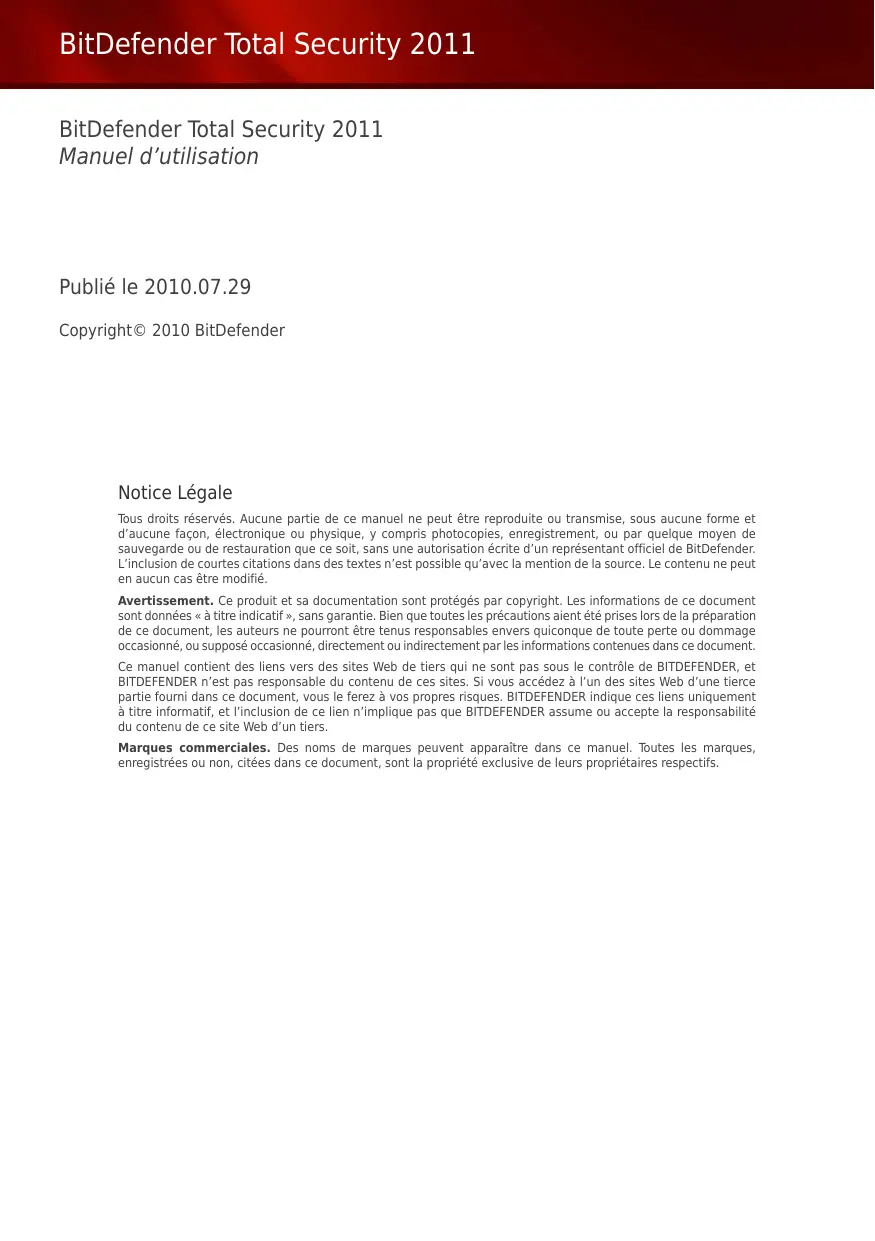 - Manuel d’utilisation Copyright© 2010 BitDefender BitDefender Total Security 2011 BitDefender Total Security 2011 Manuel d’utilisation Publié le 2010.07.29 Copyright© 2010 BitDefender Notice Légale Tous droits réservés. Aucune partie de ce manuel ne peut être reproduite ou transmise, sous aucune forme et d’aucune façon, électronique ou physique, y compris photocopies, enregistrement, ou par quelque moyen de sauvegarde ou de restauration que ce soit, sans une autorisation écrite d’un représentant officiel de BitDefender. L’inclusion de courtes citations dans des textes n’est possible qu’avec la mention de la source. Le contenu ne peut en aucun cas être modifié. Avertissement. Ce produit et sa documentation sont protégés par copyright. Les informations de ce document sont données « à titre indicatif », sans garantie. Bien que toutes les précautions aient été prises lors de la préparation de ce document, les auteurs ne pourront être tenus responsables envers quiconque de toute perte ou dommage occasionné, ou supposé occasionné, directement ou indirectement par les informations contenues dans ce document. Ce manuel contient des liens vers des sites Web de tiers qui ne sont pas sous le contrôle de BITDEFENDER, et BITDEFENDER n’est pas responsable du contenu de ces sites. Si vous accédez à l’un des sites Web d’une tierce partie fourni dans ce document, vous le ferez à vos propres risques. BITDEFENDER indique ces liens uniquement à titre informatif, et l’inclusion de ce lien n’implique pas que BITDEFENDER assume ou accepte la responsabilité du contenu de ce site Web d’un tiers. Marques commerciales. Des noms de marques peuvent apparaître dans ce manuel. Toutes les marques, enregistrées ou non, citées dans ce document, sont la propriété exclusive de leurs propriétaires respectifs. BitDefender Total Security 2011 Each man has his price Bob And yours was pretty low BitDefender Total Security 2011 Table des matières Installation et désinstallation p. 1