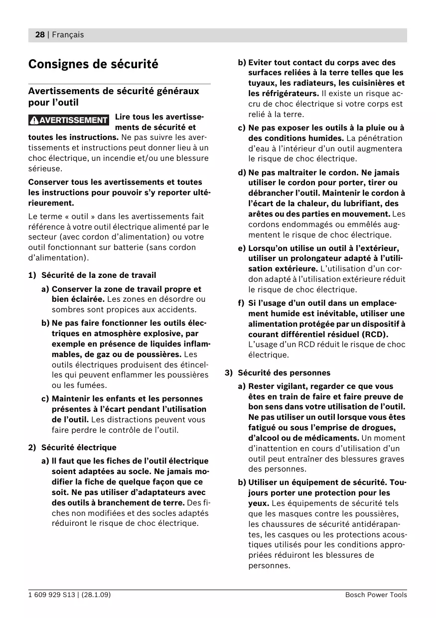 a) ll faut que les fiches de l’outil électrique soient adaptées au socle. Ne jamais modifier la fiche de quelque façon que ce soit. Ne pas utiliser d’adaptateurs avec des outils à branchement de terre. Des fiches non modifiées et des socles adaptés réduiront le risque de choc électrique. 1 609 929 S13 | (28.1.09) b) Eviter tout contact du corps avec des surfaces reliées à la terre telles que les tuyaux, les radiateurs, les cuisinières et les réfrigérateurs. Il existe un risque accru de choc électrique si votre corps est relié à la terre. c) Ne pas exposer les outils à la pluie ou à des conditions humides. La pénétration d’eau à l’intérieur d’un outil augmentera le risque de choc électrique. d) Ne pas maltraiter le cordon. Ne jamais utiliser le cordon pour porter, tirer ou débrancher l’outil. Maintenir le cordon à l’écart de la chaleur, du lubrifiant, des arêtes ou des parties en mouvement. Les cordons endommagés ou emmêlés augmentent le risque de choc électrique. e) Lorsqu’on utilise un outil à l’extérieur, utiliser un prolongateur adapté à l’utilisation extérieure. L’utilisation d’un cordon adapté à l’utilisation extérieure réduit le risque de choc électrique. f) Si l’usage d’un outil dans un emplacement humide est inévitable, utiliser une alimentation protégée par un dispositif à courant différentiel résiduel (RCD). L’usage d’un RCD réduit le risque de choc électrique.