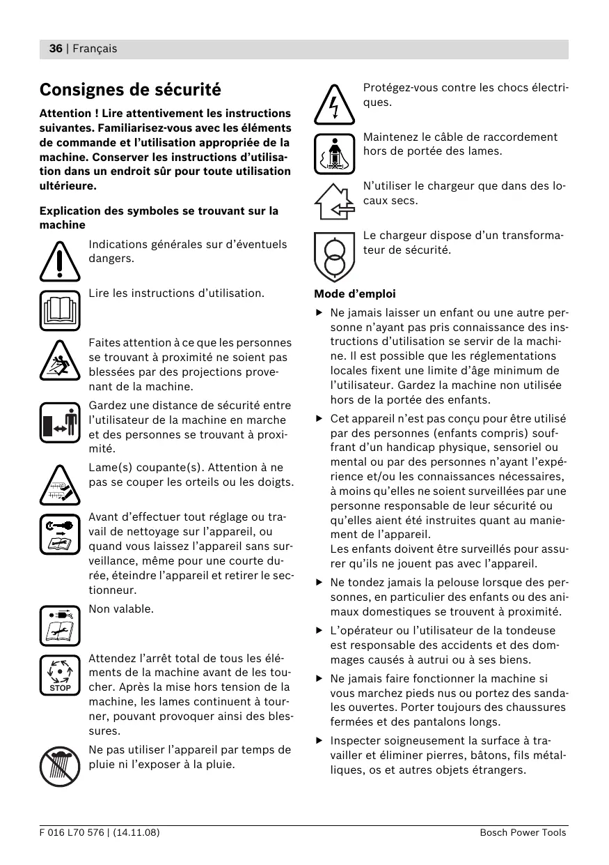 F 016 L70 576 | (14.11.08) Consignes de sécurité
