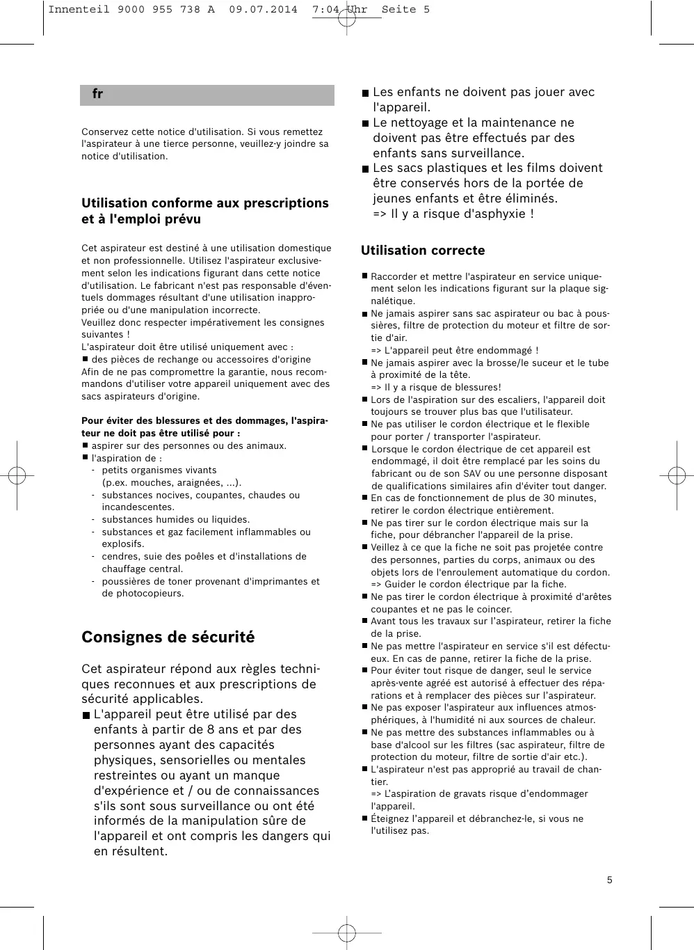 7:04 Uhr Rendre immédiatement inutilisables les appareils hors d'usage, ensuite mettre l'appareil au rebut de façon réglementaire. ! Important La prise de secteur doit être protégée par un fusible d'au moins 16 A. Si le disjoncteur se déclenche lors de la mise en marche de l'appareil, ceci peut être dû au fait que d'autres appareils électriques d'une puissance connectée élevée sont branchés en même temps sur le même circuit électrique. Le déclenchement du disjoncteur peut être évité en réglant l'appareil sur la plus faible puissance avant de le mettre en marche et en le réglant ensuite sur une puissance supérieure. Consignes pour la mise au rebut Emballage L'emballage protège l'aspirateur pendant le transport. Il est constitué de matériaux écologiques et est donc recyclable. Les matériaux d'emballage qui ne sont plus utilisés doivent être mis au rebut aux points collecteurs du système de recyclage « Point vert ». Appareil usagé Les appareils usagés contiennent souvent des matériaux précieux. Il faut donc apporter l'appareil usagé au revendeur ou à un centre de recyclage pour la revalorisation. Pour connaître les possibilités d'élimination actuelles, renseignez-vous auprès du revendeur ou de la mairie. Elimination des filtres et des sacs Les filtres et les sacs ont été fabriqués avec des matériaux compatibles avec l'environnement. Ils peuvent être éliminés avec les ordures ménagères ordinaires, à condition qu'ils ne contiennent aucune substance prohibée. Indications générales Accessoires L'apparence de vos accessoires (brosse, tube d'aspiration, etc.) peut être différentes des illustrations dans cette notice d'utilisation, le fonctionnement étant toutefois le même. Indications concernant le label énergétique Cet aspirateur est à usage général. Pour atteindre l’efficacité énergétique et la classe de performance de nettoyage déclarées sur des tapis et sols durs, veuillez utiliser la brosse universelle adaptable au type de sol. Les valeurs indiquées relatives au label énergétique ont été déterminées en utilisant les méthodes de mesure prescrites (selon EN60312-1).