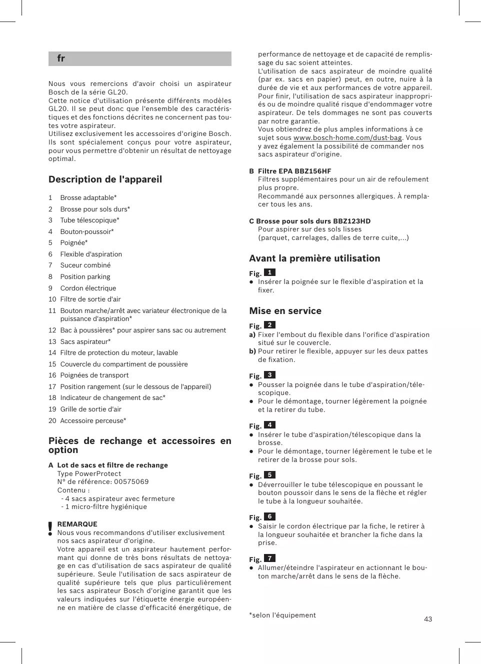 Nous vous remercions d'avoir choisi un aspirateur Bosch de la série GL20. Cette notice d'utilisation présente différents modèles GL20. Il se peut donc que l'ensemble des caractéristiques et des fonctions décrites ne concernent pas toutes votre aspirateur. Utilisez exclusivement les accessoires d'origine Bosch. Ils sont spécialement conçus pour votre aspirateur, pour vous permettre d'obtenir un résultat de nettoyage optimal.