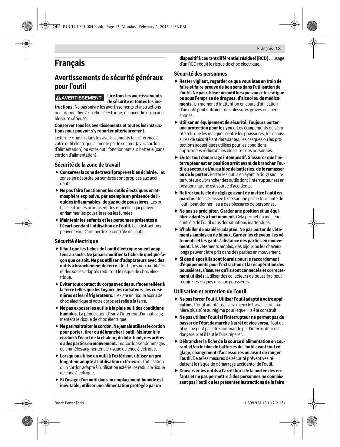 Français Avertissements de sécurité généraux pour l’outil Lire tous les avertissements de sécurité et toutes les instructions. Ne pas suivre les avertissements et instructions peut donner lieu à un choc électrique, un incendie et/ou une blessure sérieuse. Conserver tous les avertissements et toutes les instructions pour pouvoir s’y reporter ultérieurement. Le terme « outil » dans les avertissements fait référence à votre outil électrique alimenté par le secteur (avec cordon d’alimentation) ou votre outil fonctionnant sur batterie (sans cordon d’alimentation). AVERTISSEMENT Sécurité de la zone de travail Conserver la zone de travail propre et bien éclairée. Les zones en désordre ou sombres sont propices aux accidents. Ne pas faire fonctionner les outils électriques en atmosphère explosive, par exemple en présence de liquides inflammables, de gaz ou de poussières. Les outils électriques produisent des étincelles qui peuvent enflammer les poussières ou les fumées. Maintenir les enfants et les personnes présentes à l’écart pendant l’utilisation de l’outil. Les distractions peuvent vous faire perdre le contrôle de l’outil. Sécurité électrique Il faut que les fiches de l’outil électrique soient adaptées au socle. Ne jamais modifier la fiche de quelque façon que ce soit. Ne pas utiliser d’adaptateurs avec des outils à branchement de terre. Des fiches non modifiées et des socles adaptés réduiront le risque de choc électrique. Eviter tout contact du corps avec des surfaces reliées à la terre telles que les tuyaux, les radiateurs, les cuisinières et les réfrigérateurs. Il existe un risque accru de choc électrique si votre corps est relié à la terre. Ne pas exposer les outils à la pluie ou à des conditions humides. La pénétration d’eau à l’intérieur d’un outil augmentera le risque de choc électrique. Ne pas maltraiter le cordon. Ne jamais utiliser le cordon pour porter, tirer ou débrancher l’outil. Maintenir le cordon à l’écart de la chaleur, du lubrifiant, des arêtes ou des parties en mouvement. Les cordons endommagés ou emmêlés augmentent le risque de choc électrique. Lorsqu’on utilise un outil à l’extérieur, utiliser un prolongateur adapté à l’utilisation extérieure. L’utilisation d’un cordon adapté à l’utilisation extérieure réduit le risque de choc électrique. Si l’usage d’un outil dans un emplacement humide est inévitable, utiliser une alimentation protégée par un dispositif à courant différentiel résiduel (RCD). L’usage d’un RCD réduit le risque de choc électrique. Sécurité des personnes Rester vigilant, regarder ce que vous êtes en train de faire et faire preuve de bon sens dans l’utilisation de l’outil. Ne pas utiliser un outil lorsque vous êtes fatigué ou sous l’emprise de drogues, d’alcool ou de médicaments. Un moment d’inattention en cours d’utilisation d’un outil peut entraîner des blessures graves des personnes. Utiliser un équipement de sécurité. Toujours porter une protection pour les yeux. Les équipements de sécurité tels que les masques contre les poussières, les chaussures de sécurité antidérapantes, les casques ou les protections acoustiques utilisés pour les conditions appropriées réduiront les blessures des personnes. Eviter tout démarrage intempestif. S’assurer que l’interrupteur est en position arrêt avant de brancher l’outil au secteur et/ou au bloc de batteries, de le ramasser ou de le porter. Porter les outils en ayant le doigt sur l’interrupteur ou brancher des outils dont l’interrupteur est en position marche est source d’accidents. Retirer toute clé de réglage avant de mettre l’outil en marche. Une clé laissée fixée sur une partie tournante de l’outil peut donner lieu à des blessures de personnes. Ne pas se précipiter. Garder une position et un équilibre adaptés à tout moment. Cela permet un meilleur contrôle de l’outil dans des situations inattendues. S’habiller de manière adaptée. Ne pas porter de vêtements amples ou de bijoux. Garder les cheveux, les vêtements et les gants à distance des parties en mouvement. Des vêtements amples, des bijoux ou les cheveux longs peuvent être pris dans des parties en mouvement. Si des dispositifs sont fournis pour le raccordement d’équipements pour l’extraction et la récupération des poussières, s’assurer qu’ils sont connectés et correctement utilisés. Utiliser des collecteurs de poussière peut réduire les risques dus aux poussières. Utilisation et entretien de l’outil Ne pas forcer l’outil. Utiliser l’outil adapté à votre application. L’outil adapté réalisera mieux le travail et de manière plus sûre au régime pour lequel il a été construit. Ne pas utiliser l’outil si l’interrupteur ne permet pas de passer de l’état de marche à arrêt et vice versa. Tout outil qui ne peut pas être commandé par l’interrupteur est dangereux et il faut le faire réparer. Débrancher la fiche de la source d’alimentation en courant et/ou le bloc de batteries de l’outil avant tout réglage, changement d’accessoires ou avant de ranger l’outil. De telles mesures de sécurité préventives réduisent le risque de démarrage accidentel de l’outil. Conserver les outils à l’arrêt hors de la portée des enfants et ne pas permettre à des personnes ne connaissant pas l’outil ou les présentes instructions de le faire 1 609 92A 13U | (2.2.15) 14 | Français fonctionner. Les outils sont dangereux entre les mains d’utilisateurs novices. Observer la maintenance de l’outil. Vérifier qu’il n’y a pas de mauvais alignement ou de blocage des parties mobiles, des pièces cassées ou toute autre condition pouvant affecter le fonctionnement de l’outil. En cas de dommages, faire réparer l’outil avant de l’utiliser. De nombreux accidents sont dus à des outils mal entretenus. Garder affûtés e