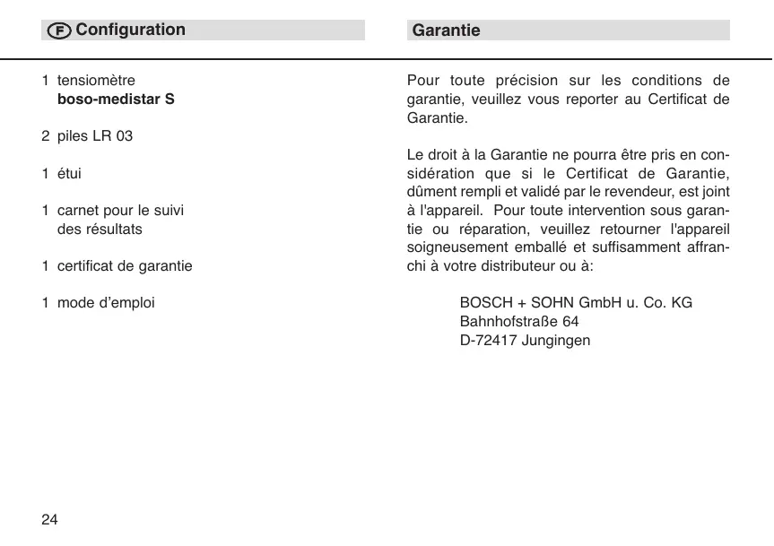 Le droit à la Garantie ne pourra être pris en considération que si le Certificat de Garantie, dûment rempli et validé par le revendeur, est joint à l'appareil. Pour toute intervention sous garantie ou réparation, veuillez retourner l'appareil soigneusement emballé et suffisamment affranchi à votre distributeur ou à: BOSCH + SOHN GmbH u. Co. KG Bahnhofstraße 64 D-72417 Jungingen Recommandations: ● Ne pas soumettre l’appareil à des températures extrêmes, et éviter de l’exposer au rayonnement direct du soleil. Ne pas le soumettre à des chocs trop violents et le protéger de l’humidité et des salissures. ● Afin d’éviter une détérioration due à des piles qui coulent, les retirer de l’appareil durant des périodes d’inutilisation prolongée. ● Les appareils électriques medicaux sont soumis à des mesures de précautions particulières en ce qui concerne la compatibilité électromagnétique (CEM). Sur simple demande au fabricant, vous pouvez obtenir des explications plus précises. Description du produit Principe de fonctionnement Ce tensiomètre est conforme à la législation européenne sur les produits médicaux ( Symbole CE ) ainsi qu'à la norme européenne EN 1060, 1ère partie "Tensiomètres non invasifs Exigences générales" et 3ème partie "Exigences complémentaires concernant les systèmes électroniques de mesure de la pression sanguine". Les organes de mesures de l'appareil doivent être soumis à un contrôle régulier, conformément à la réglementation nationale en vigueur. La procédure de contrôle est détaillée à la page 34. ● Le brassard est prévu pour un tour de poignet de 13,5 à 19,5 cm. ● Eviter de manipuler le brassard avec des objets pointus, aiguilles ou ciseaux.