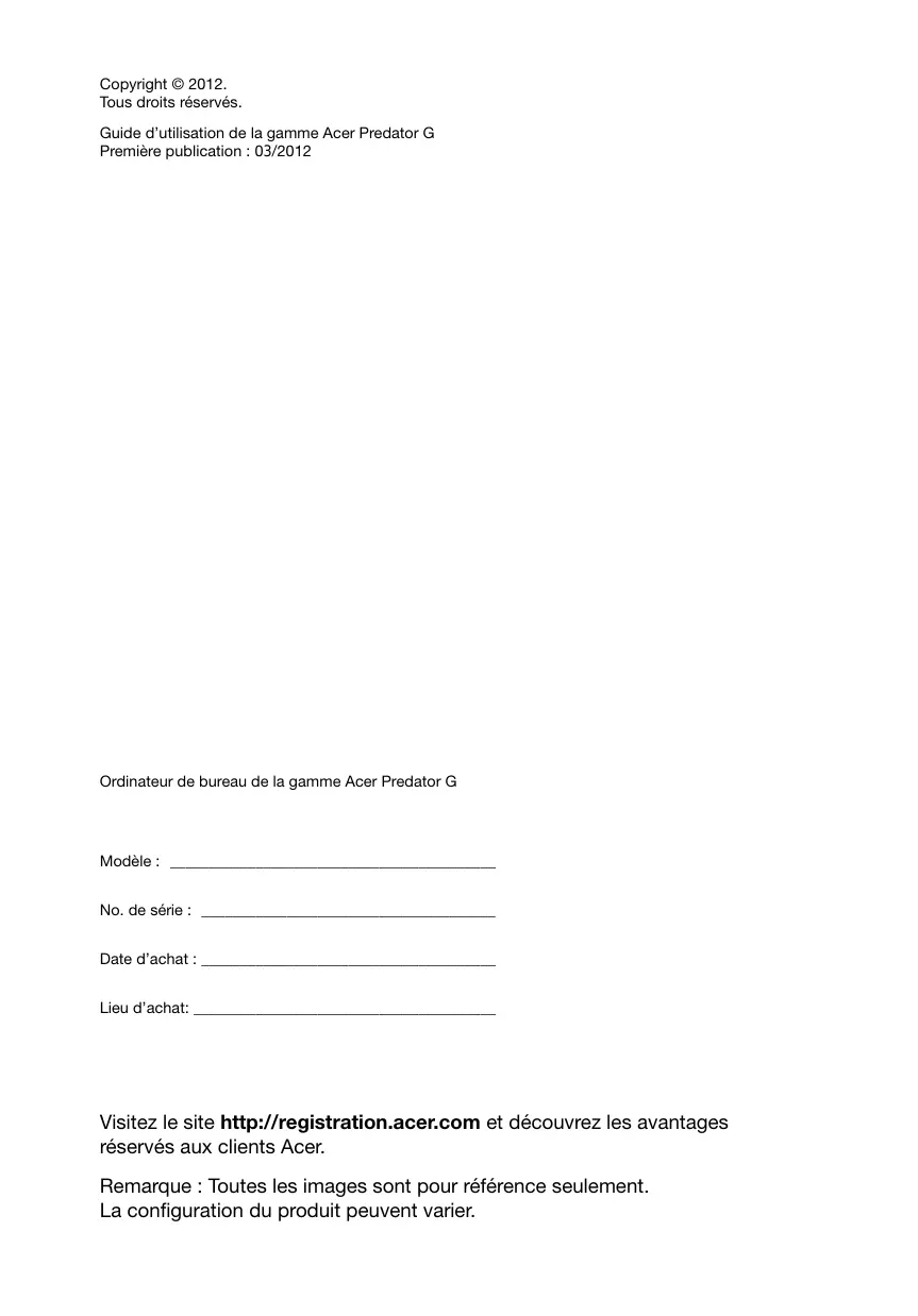 Copyright © 2012. Tous droits réservés. Guide d’utilisation de la gamme Acer Predator G Première publication : 03/2012