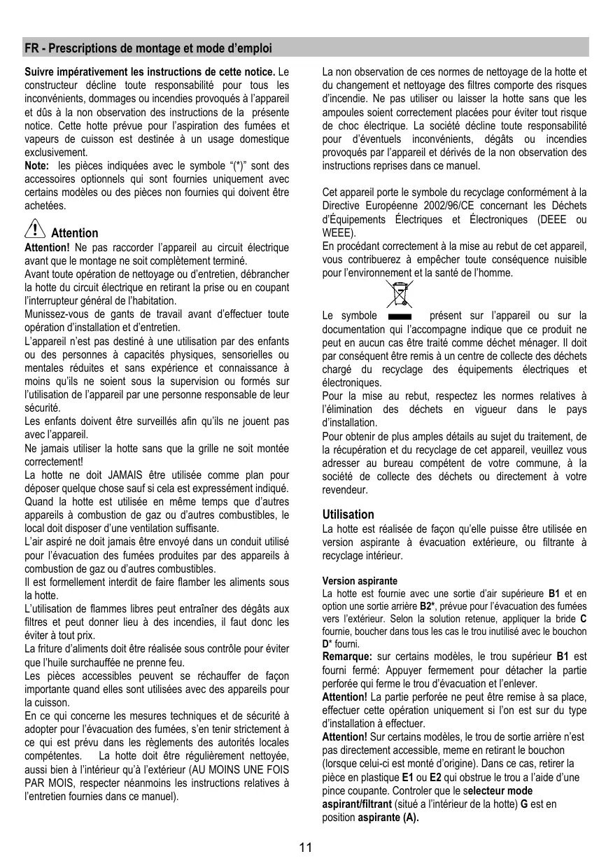 FR - Prescriptions de montage et mode d’emploi Suivre impérativement les instructions de cette notice. Le constructeur décline toute responsabilité pour tous les inconvénients, dommages ou incendies provoqués à l’appareil et dûs à la non observation des instructions de la présente notice. Cette hotte prévue pour l’aspiration des fumées et vapeurs de cuisson est destinée à un usage domestique exclusivement. Note: les pièces indiquées avec le symbole “(*)” sont des accessoires optionnels qui sont fournies uniquement avec certains modèles ou des pièces non fournies qui doivent être achetées. La non observation de ces normes de nettoyage de la hotte et du changement et nettoyage des filtres comporte des risques d’incendie. Ne pas utiliser ou laisser la hotte sans que les ampoules soient correctement placées pour éviter tout risque de choc électrique. La société décline toute responsabilité pour d’éventuels inconvénients, dégâts ou incendies provoqués par l’appareil et dérivés de la non observation des instructions reprises dans ce manuel. Cet appareil porte le symbole du recyclage conformément à la Directive Européenne 2002/96/CE concernant les Déchets d’Équipements Électriques et Électroniques (DEEE ou WEEE). En procédant correctement à la mise au rebut de cet appareil, vous contribuerez à empêcher toute conséquence nuisible pour l’environnement et la santé de l’homme. Attention Attention! Ne pas raccorder l’appareil au circuit électrique avant que le montage ne soit complètement terminé. Avant toute opération de nettoyage ou d’entretien, débrancher la hotte du circuit électrique en retirant la prise ou en coupant l’interrupteur général de l’habitation. Munissez-vous de gants de travail avant d’effectuer toute opération d’installation et d’entretien. L’appareil n’est pas destiné à une utilisation par des enfants ou des personnes à capacités physiques, sensorielles ou mentales réduites et sans expérience et connaissance à moins qu’ils ne soient sous la supervision ou formés sur l’utilisation de l’appareil par une personne responsable de leur sécurité. Les enfants doivent être surveillés afin qu’ils ne jouent pas avec l’appareil. Ne jamais utiliser la hotte sans que la grille ne soit montée correctement! La hotte ne doit JAMAIS être utilisée comme plan pour déposer quelque chose sauf si cela est expressément indiqué. Quand la hotte est utilisée en même temps que d’autres appareils à combustion de gaz ou d’autres combustibles, le local doit disposer d’une ventilation suffisante. L’air aspiré ne doit jamais être envoyé dans un conduit utilisé pour l’évacuation des fumées produites par des appareils à combustion de gaz ou d’autres combustibles. Il est formellement interdit de faire flamber les aliments sous la hotte. L’utilisation de flammes libres peut entraîner des dégâts aux filtres et peut donner lieu à des incendies, il faut donc les éviter à tout prix. La friture d’aliments doit être réalisée sous contrôle pour éviter que l’huile surchauffée ne prenne feu. Les pièces accessibles peuvent se réchauffer de façon importante quand elles sont utilisées avec des appareils pour la cuisson. En ce qui concerne les mesures techniques et de sécurité à adopter pour l’évacuation des fumées, s’en tenir strictement à ce qui est prévu dans les règlements des autorités locales compétentes. La hotte doit être régulièrement nettoyée, aussi bien à l’intérieur qu’à l’extérieur (AU MOINS UNE FOIS PAR MOIS, respecter néanmoins les instructions relatives à l’entretien fournies dans ce manuel). présent sur l’appareil ou sur la Le symbole documentation qui l’accompagne indique que ce produit ne peut en aucun cas être traité comme déchet ménager. Il doit par conséquent être remis à un centre de collecte des déchets chargé du recyclage des équipements électriques et électroniques. Pour la mise au rebut, respectez les normes relatives à l’élimination des déchets en vigueur dans le pays d’installation. Pour obtenir de plus amples détails au sujet du traitement, de la récupération et du recyclage de cet appareil, veuillez vous adresser au bureau compétent de votre commune, à la société de collecte des déchets ou directement à votre revendeur. Utilisation La hotte est réalisée de façon qu’elle puisse être utilisée en version aspirante à évacuation extérieure, ou filtrante à recyclage intérieur. Version aspirante La hotte est fournie avec une sortie d’air supérieure B1 et en option une sortie arrière B2*, prévue pour l’évacuation des fumées vers l’extérieur. Selon la solution retenue, appliquer la bride C fournie, boucher dans tous les cas le trou inutilisé avec le bouchon D* fourni. Remarque: sur certains modèles, le trou supérieur B1 est fourni fermé: Appuyer fermement pour détacher la partie perforée qui ferme le trou d’évacuation et l’enlever. Attention! La partie perforée ne peut être remise à sa place, effectuer cette opération uniquement si l’on est sur du type d’installation à effectuer. Attention! Sur certains modèles, le trou de sortie arrière n’est pas directement accessible, meme en retirant le bouchon (lorsque celui-ci est monté d’origine). Dans ce cas, retirer la pièce en plastique E1 ou E2 qui obstrue le trou a l’aide d’une pince coupante. Controler que le selecteur mode aspirant/filtrant (situé a l’intérieur de la hotte) G est en position aspirante (A).