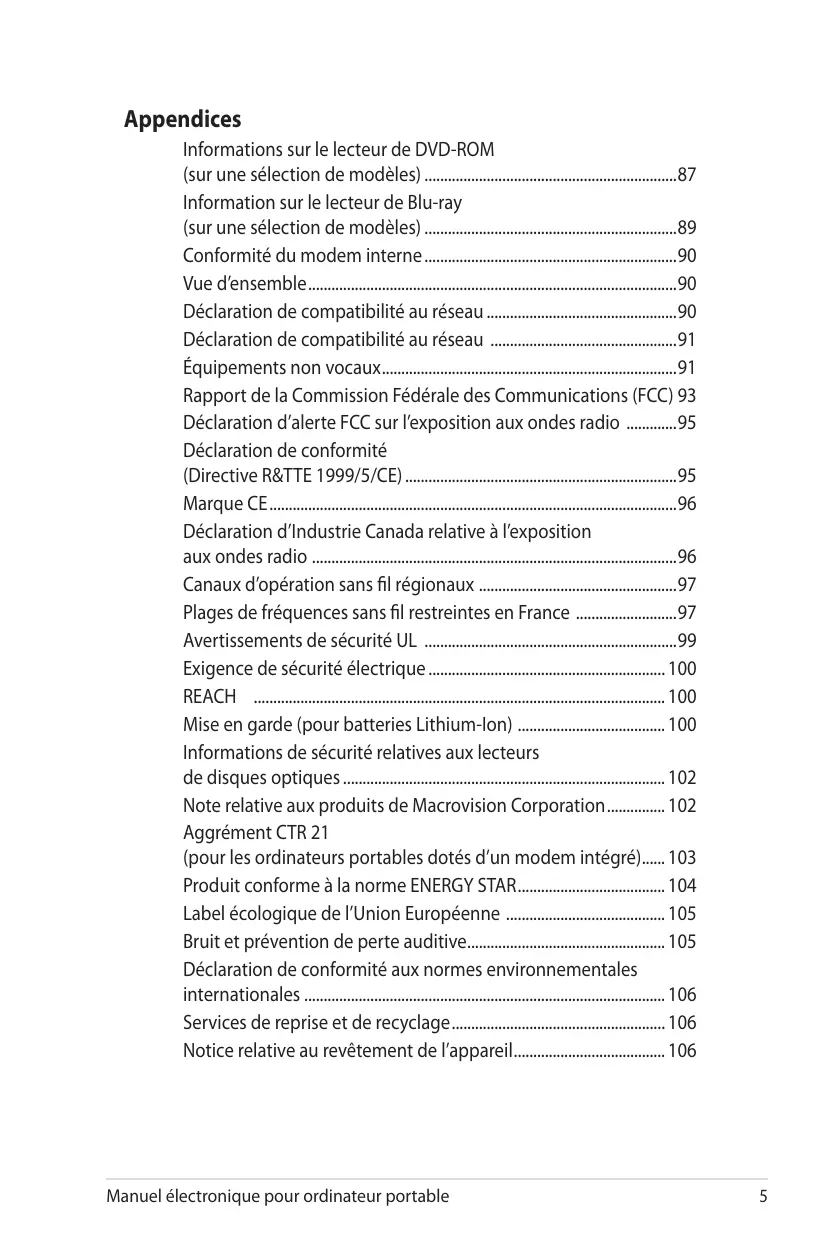 - Aggrément CTR 21 (pour les ordinateurs portables dotés d’un modem intégré) p. 103