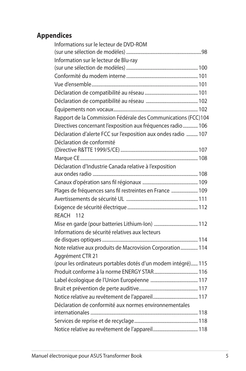 • Manuel électronique pour ASUS Transformer Book Appendices Informations sur le lecteur de DVD-ROM (sur une sélection de modèles) p. 98