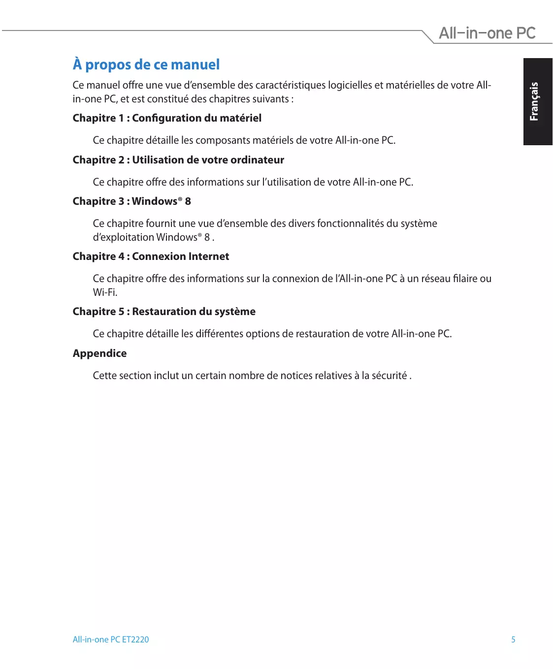 Ce chapitre détaille les différentes options de restauration de votre All-in-one PC. Appendice Cette section inclut un certain nombre de notices relatives à la sécurité . All-in-one PC ET2220