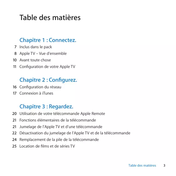 | Configuration de votre Apple TV | « Configuration de votre Apple TV » à la page 11 |