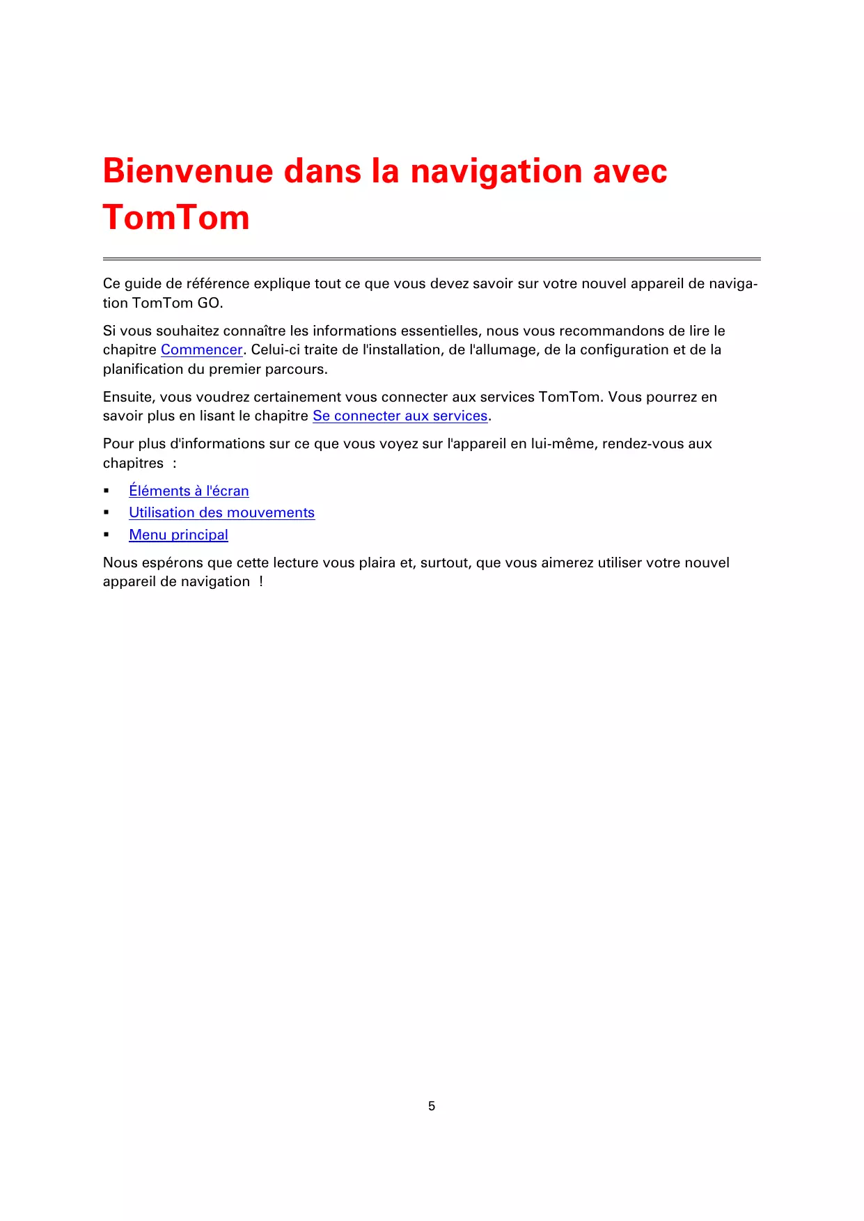 Bienvenue dans la navigation avec TomTom Ce guide de référence explique tout ce que vous devez savoir sur votre nouvel appareil de navigation TomTom GO. Si vous souhaitez connaître les informations essentielles, nous vous recommandons de lire le chapitre Commencer. Celui-ci traite de l'installation, de l'allumage, de la configuration et de la planification du premier parcours. Ensuite, vous voudrez certainement vous connecter aux services TomTom. Vous pourrez en savoir plus en lisant le chapitre Se connecter aux services. Pour plus d'informations sur ce que vous voyez sur l'appareil en lui-même, rendez-vous aux chapitres :