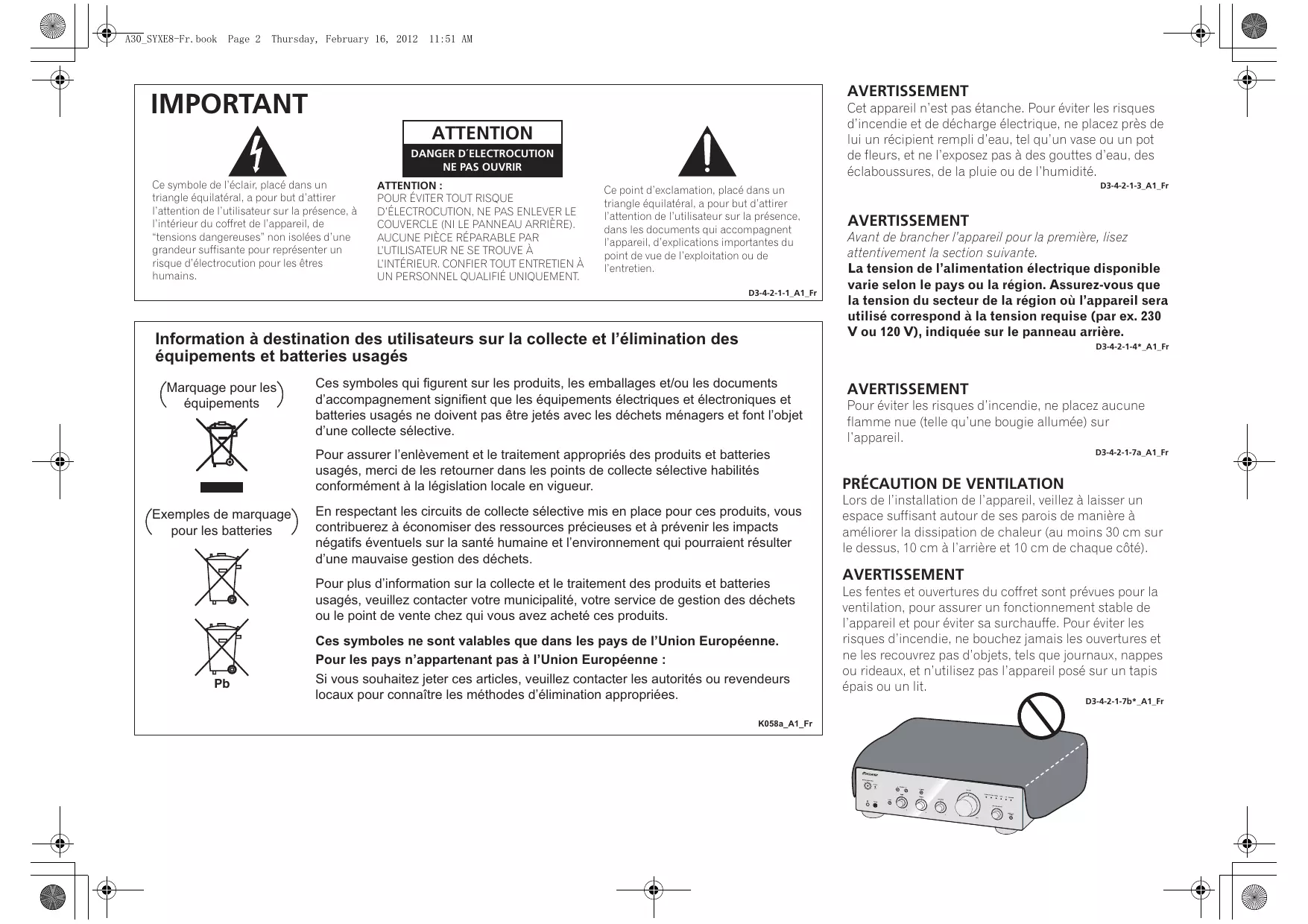 à d’autres câbles. Les câbles d’alimentation doivent être posés de façon à ne pas être écrasés. Un câble abîmé peut provoquer un risque d’incendie ou un choc électrique. Vérifier le câble d’alimentation de temps en temps. Contacter le service après-vente PIONEER le plus proche ou le revendeur pour un remplacement. S002*_A1_Fr