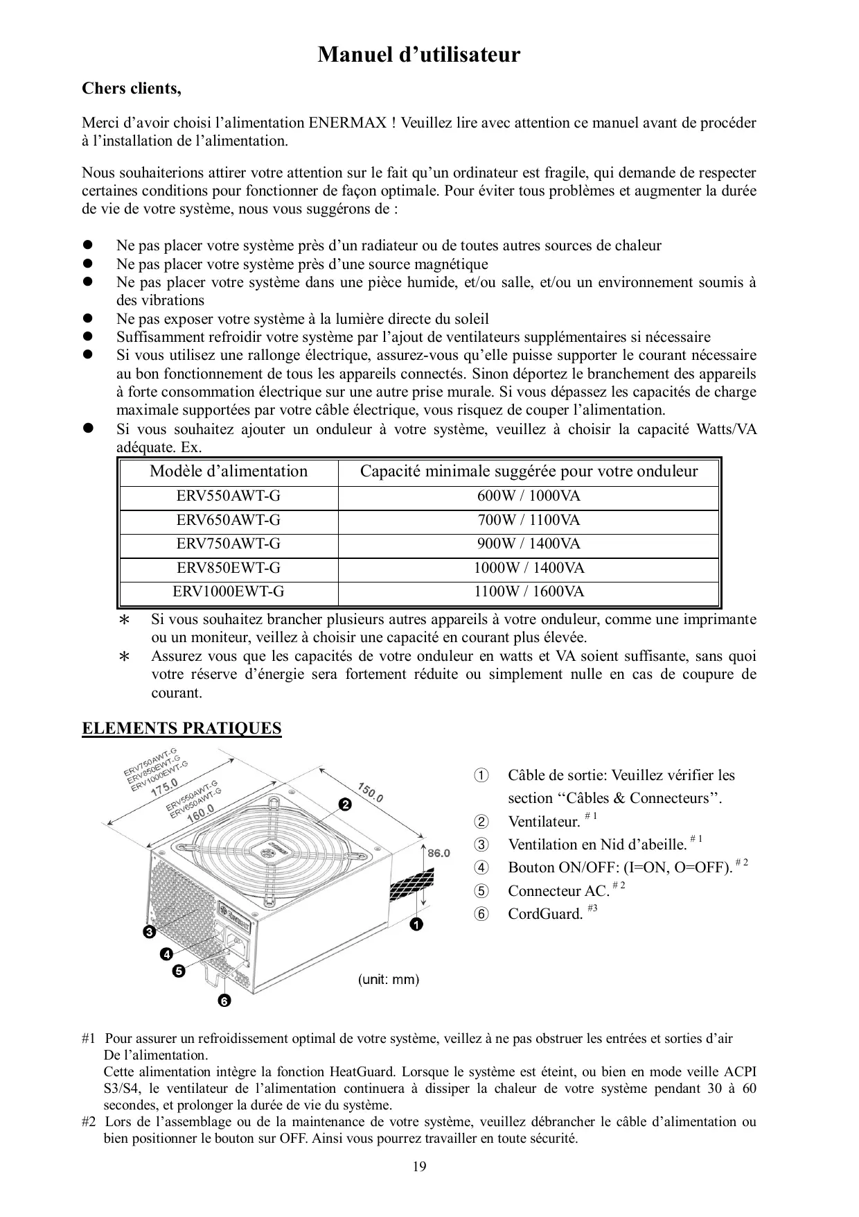 1. Pour assurer un refroidissement optimal de votre système, veillez à ne pas obstruer les entrées et sorties d'air de l'alimentation. Cette alimentation intègre la fonction HeatGuard. Lorsque le système est éteint, ou bien en mode veille ACPI S3/S4, le ventilateur de l'alimentation continue à dissiper la chaleur de votre système pendant 30 à 60 secondes, et prolonge ainsi la durée de vie du système. 2. Lors de l'assemblage ou de la maintenance de votre système, veuillez débrancher le câble d'alimentation ou bien positionner le bouton sur OFF. Ainsi, vous pourrez travailler en toute sécurité.