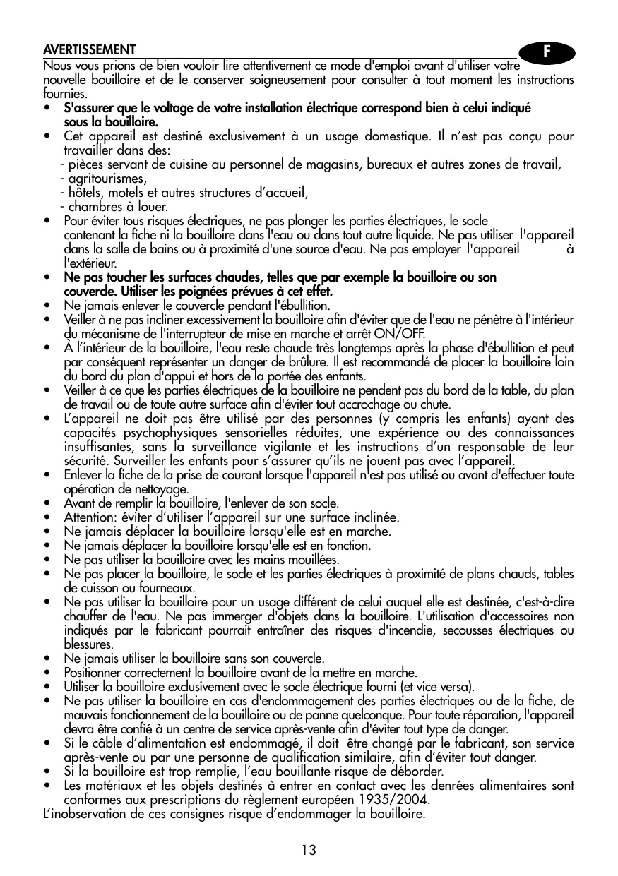 - Les matériaux et les objets destinés à entrer en contact avec les denrées alimentaires sont conformes aux prescriptions du règlement européen 1935/2004. L’inobservation de ces consignes risque d’endommager la bouilloire.