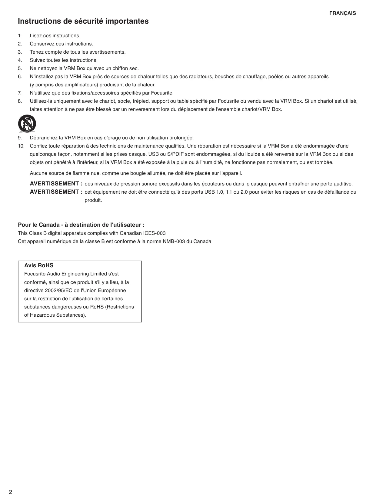 Utilisez-la uniquement avec le chariot, socle, trépied, support ou table spécifié par Focusrite ou vendu avec la VRM Box. Si un chariot est utilisé, (y compris des amplificateurs) produisant de la chaleur. faites attention à ne pas être blessé par un renversement lors du déplacement de l'ensemble chariot/VRM Box.