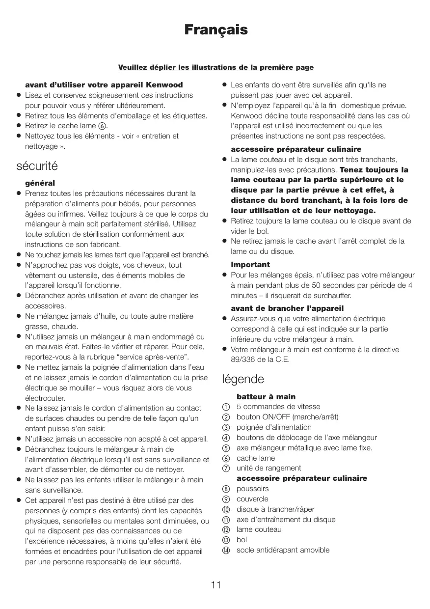 Les enfants doivent être surveillés afin qu'ils ne puissent pas jouer avec cet appareil. N’employez l’appareil qu’à la fin domestique prévue. Kenwood décline toute responsabilité dans les cas où l’appareil est utilisé incorrectement ou que les présentes instructions ne sont pas respectées. accessoire préparateur culinaire La lame couteau et le disque sont très tranchants, manipulez-les avec précautions. Tenez toujours la lame couteau par la partie supérieure et le disque par la partie prévue à cet effet, à distance du bord tranchant, à la fois lors de leur utilisation et de leur nettoyage. Retirez toujours la lame couteau ou le disque avant de vider le bol. Ne retirez jamais le cache avant l’arrêt complet de la lame ou du disque. important Pour les mélanges épais, n’utilisez pas votre mélangeur à main pendant plus de 50 secondes par période de 4 minutes – il risquerait de surchauffer. avant de brancher l’appareil Assurez-vous que votre alimentation électrique correspond à celle qui est indiquée sur la partie inférieure du votre mélangeur à main. Votre mélangeur à main est conforme à la directive 89/336 de la C.E. légende batteur à main 5 commandes de vitesse bouton ON/OFF (marche/arrêt) poignée d’alimentation boutons de déblocage de l’axe mélangeur axe mélangeur métallique avec lame fixe. cache lame unité de rangement accessoire préparateur culinaire poussoirs couvercle disque à trancher/râper axe d’entraînement du disque lame couteau bol socle antidérapant amovible