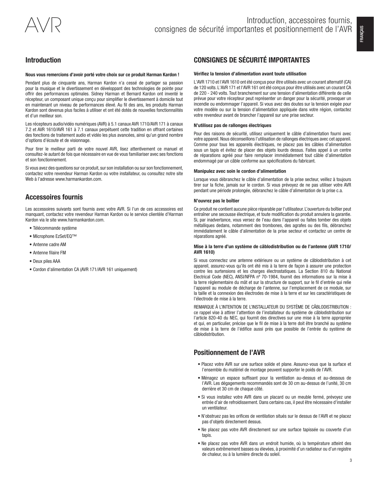 des fonctions de traitement audio et vidéo les plus avancées, ainsi qu’un grand nombre d’options d’écoute et de visionnage. N’utilisez pas de rallonges électriques Pour tirer le meilleur parti de votre nouvel AVR, lisez attentivement ce manuel et consultez-le autant de fois que nécessaire en vue de vous familiariser avec ses fonctions et son fonctionnement. Si vous avez des questions sur ce produit, sur son installation ou sur son fonctionnement, contactez votre revendeur Harman Kardon ou votre installateur, ou consultez notre site Web à l’adresse www.harmankardon.com. Accessoires fournis Les accessoires suivants sont fournis avec votre AVR. Si l’un de ces accessoires est manquant, contactez votre revendeur Harman Kardon ou le service clientèle d’Harman Kardon via le site www.harmankardon.com. ŘTélécommande système ŘMicrophone EzSet/EQ™ ŘAntenne cadre AM ŘAntenne filaire FM ŘDeux piles AAA ŘCordon d'alimentation CA (AVR 171/AVR 161 uniquement) Pour des raisons de sécurité, utilisez uniquement le câble d’alimentation fourni avec votre appareil. Nous déconseillons l’utilisation de rallonges électriques avec cet appareil. Comme pour tous les appareils électriques, ne placez pas les câbles d’alimentation sous un tapis et évitez de placer des objets lourds dessus. Faites appel à un centre de réparations agréé pour faire remplacer immédiatement tout câble d’alimentation endommagé par un câble conforme aux spécifications du fabricant. Manipulez avec soin le cordon d’alimentation Lorsque vous débranchez le câble d’alimentation de la prise secteur, veillez à toujours tirer sur la fiche, jamais sur le cordon. Si vous prévoyez de ne pas utiliser votre AVR pendant une période prolongée, débranchez le câble d’alimentation de la prise c.a. N’ouvrez pas le boîtier Ce produit ne contient aucune pièce réparable par l’utilisateur. L’ouverture du boîtier peut entraîner une secousse électrique, et toute modification du produit annulera la garantie. Si, par inadvertance, vous versez de l’eau dans l’appareil ou faites tomber des objets métalliques dedans, notamment des trombones, des agrafes ou des fils, débranchez immédiatement le câble d’alimentation de la prise secteur et contactez un centre de réparations agréé. Mise à la terre d’un système de câblodistribution ou de l’antenne (AVR 1710/ AVR 1610) Si vous connectez une antenne extérieure ou un système de câblodistribution à cet appareil, assurez-vous qu’ils ont été mis à la terre de façon à assurer une protection contre les surtensions et les charges électrostatiques. La Section 810 du National Electrical Code (NEC), ANSI/NFPA nº 70-1984, fournit des informations sur la mise à la terre réglementaire du mât et sur la structure de support, sur le fil d’entrée qui relie l’appareil au module de décharge de l’antenne, sur l’emplacement de ce module, sur la taille et la connexion des électrodes de mise à la terre et sur les caractéristiques de l’électrode de mise à la terre. REMARQUE À L’INTENTION DE L’INSTALLATEUR DU SYSTÈME DE CÂBLODISTRIBUTION : ce rappel vise à attirer l’attention de l’installateur du système de câblodistribution sur l’article 820-40 du NEC, qui fournit des directives sur une mise à la terre appropriée et qui, en particulier, précise que le fil de mise à la terre doit être branché au système de mise à la terre de l’édifice aussi près que possible de l’entrée du système de câblodistribution. Positionnement de l’AVR ŘPlacez votre AVR sur une surface solide et plane. Assurez-vous que la surface et l’ensemble du matériel de montage peuvent supporter le poids de l’AVR. ŘMénagez un espace suffisant pour la ventilation au-dessus et au-dessous de l’AVR. Les dégagements recommandés sont de 30 cm au-dessus de l’unité, 30 cm derrière et 30 cm de chaque côté. ŘSi vous installez votre AVR dans un placard ou un meuble fermé, prévoyez une entrée d’air de refroidissement. Dans certains cas, il peut être nécessaire d’installer un ventilateur. ŘN’obstruez pas les orifices de ventilation situés sur le dessus de l’AVR et ne placez pas d’objets directement dessus. ŘNe placez pas votre AVR directement sur une surface tapissée ou couverte d’un tapis. ŘNe placez pas votre AVR dans un endroit humide, où la température atteint des valeurs extrêmement basses ou élevées, à proximité d’un radiateur ou d’un registre de chaleur, ou à la lumière directe du soleil.
