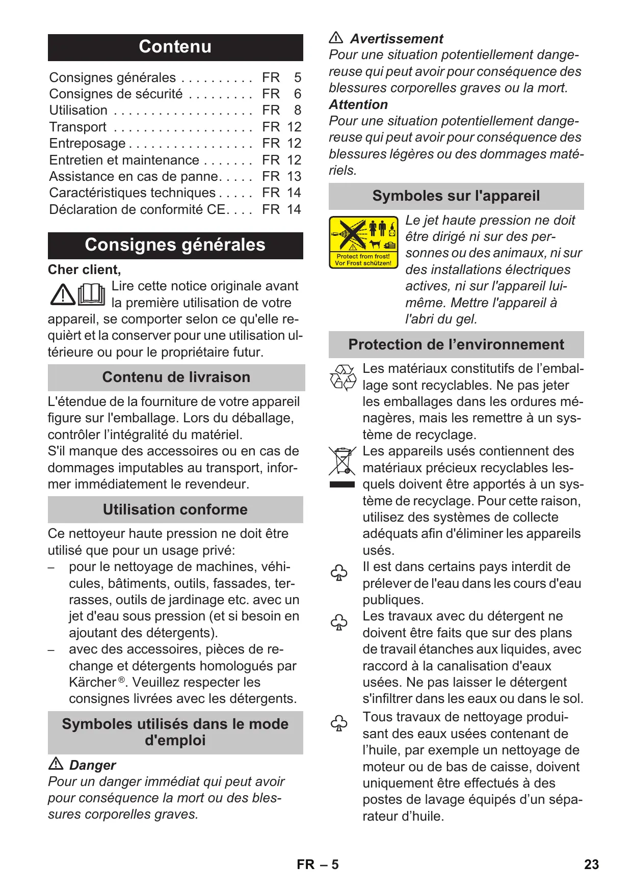 Avertissement Pour une situation potentiellement dangereuse qui peut avoir pour conséquence des blessures corporelles graves ou la mort. Attention Pour une situation potentiellement dangereuse qui peut avoir pour conséquence des blessures légères ou des dommages matériels. Symboles sur l'appareil Le jet haute pression ne doit être dirigé ni sur des personnes ou des animaux, ni sur des installations électriques actives, ni sur l'appareil luimême. Mettre l'appareil à l'abri du gel. Consignes générales Cher client, Lire cette notice originale avant la première utilisation de votre appareil, se comporter selon ce qu'elle requièrt et la conserver pour une utilisation ultérieure ou pour le propriétaire futur. Protection de l’environnement Contenu de livraison L'étendue de la fourniture de votre appareil figure sur l'emballage. Lors du déballage, contrôler l’intégralité du matériel. S'il manque des accessoires ou en cas de dommages imputables au transport, informer immédiatement le revendeur. Utilisation conforme Ce nettoyeur haute pression ne doit être utilisé que pour un usage privé: – pour le nettoyage de machines, véhicules, bâtiments, outils, fassades, terrasses, outils de jardinage etc. avec un jet d'eau sous pression (et si besoin en ajoutant des détergents). – avec des accessoires, pièces de rechange et détergents homologués par Kärcher ®. Veuillez respecter les consignes livrées avec les détergents. Symboles utilisés dans le mode d'emploi
